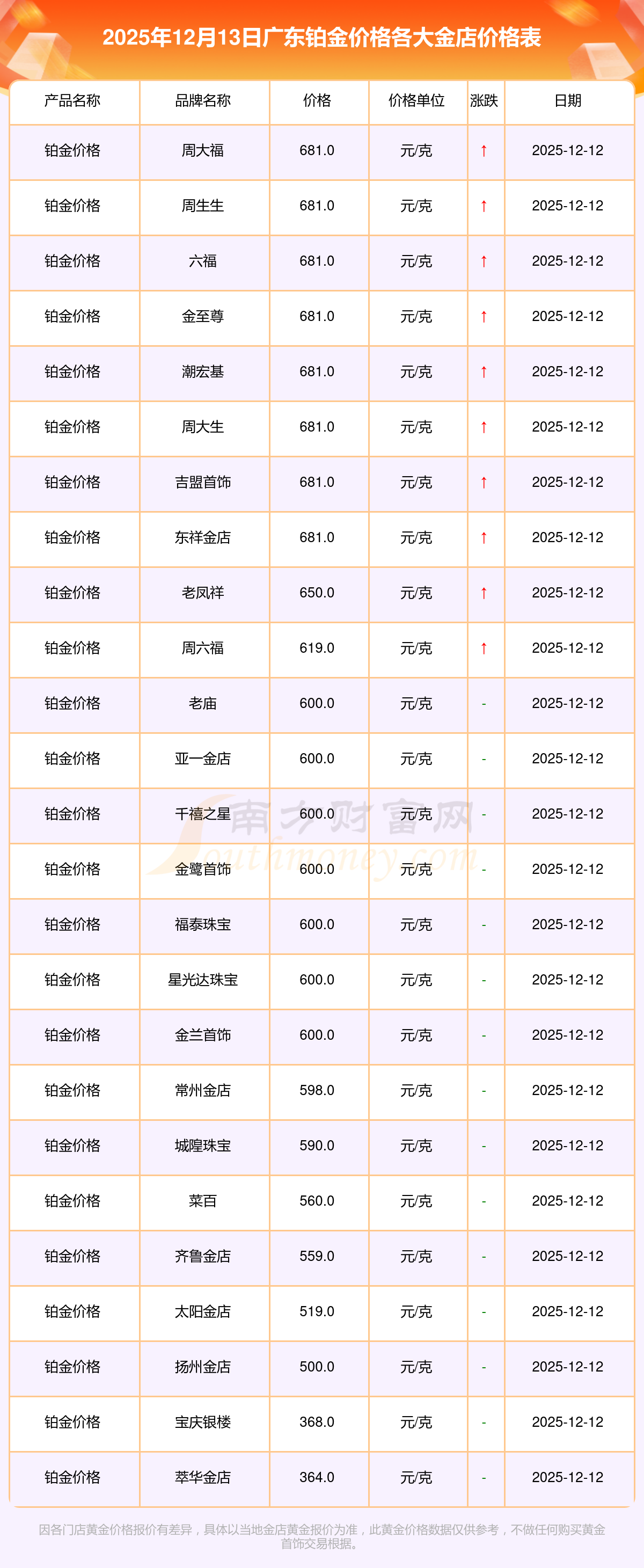 广东各金店铂金价格有所区别的。今天是2025年12月13日,广东周大福、周大福、老凤祥、老凤祥、老庙、老庙、周生生、周生生、周大福、周大福、周大福等各大金店品牌铂金价格最新价格行情是这样的:周大福1336.0元/克、周大福681.0元/克、老凤祥1337.0元/克、老凤祥650.0元/克、老庙1339.0元/克、老庙600.0元/克、周生生1338.0元/克、周生生681.0元/克、周大福1336.0元/克、周大福47410.0、周大福19550.0。