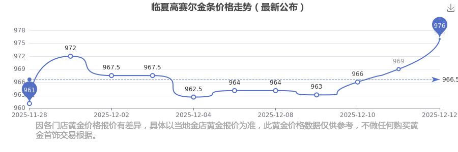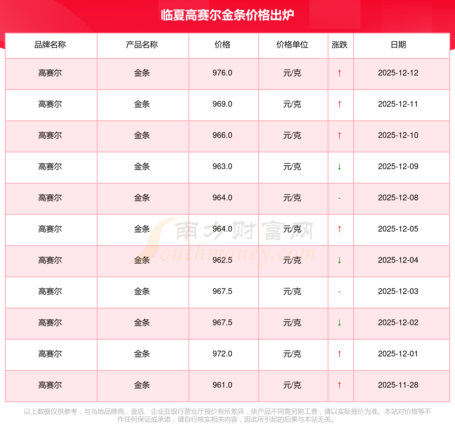 临夏高赛尔现在金条价格每克多少?现在买一克黄金得花多少钱?今日临夏高赛尔金条价格查询,今日2025年12月13日,临夏高赛尔金条价格为976.0元/克。