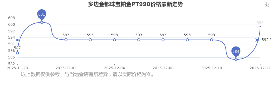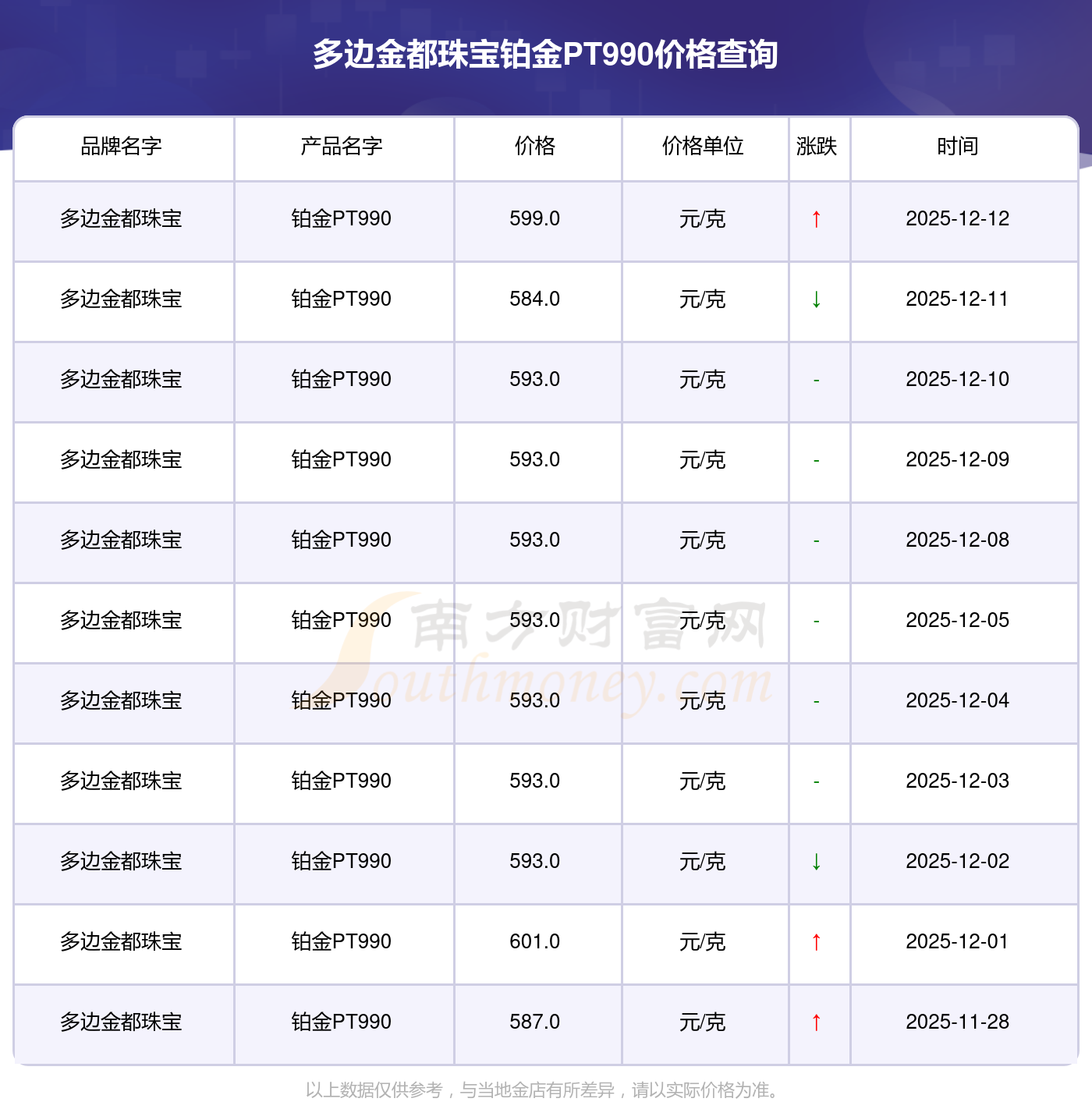 今日多边金都珠宝铂金PT990的价格是599.0元/克。