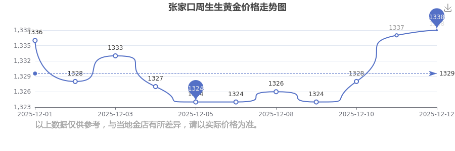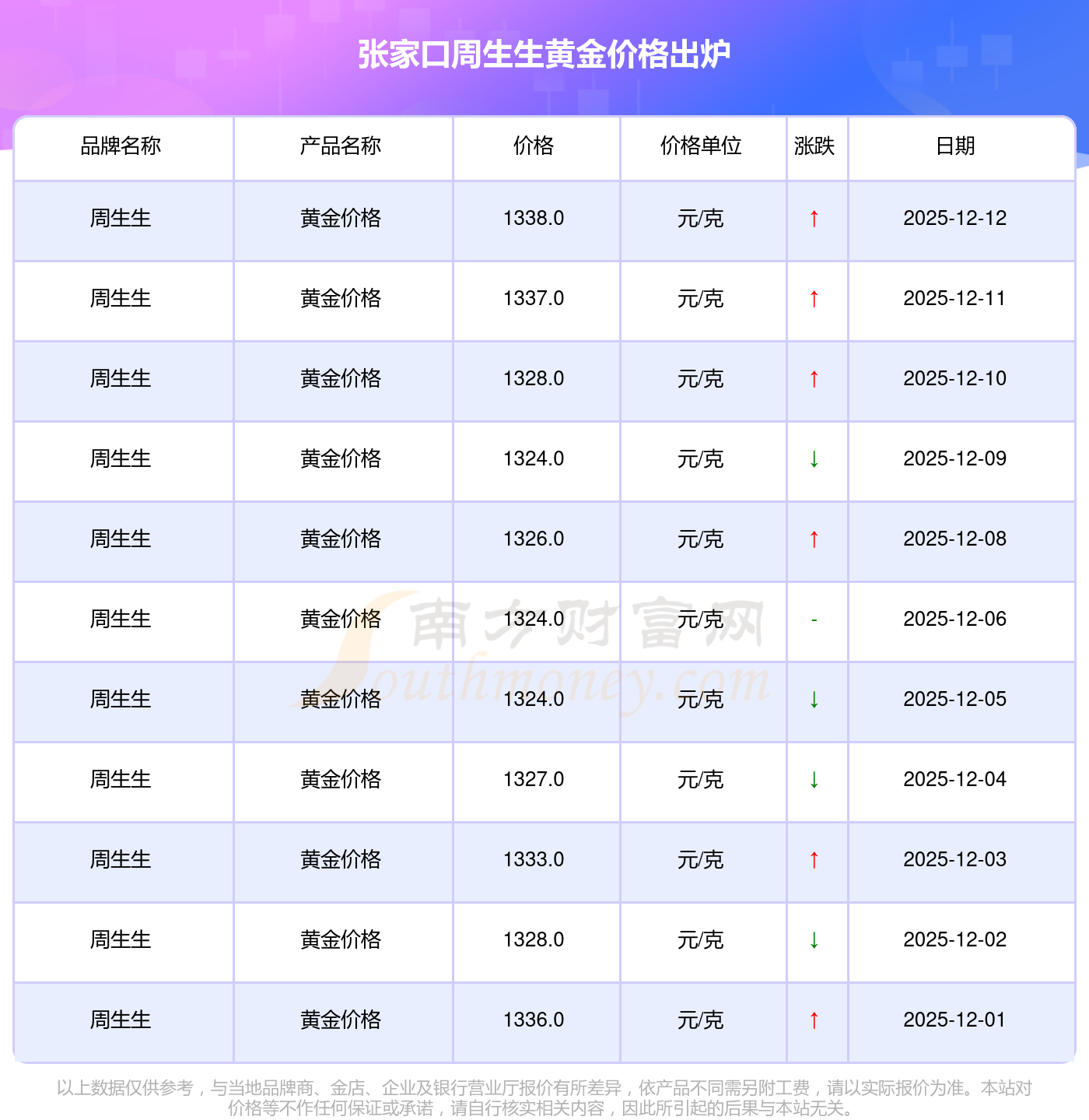 今日(2025年12月13日),张家口周生生黄金价格每克的价值为1338.0元/克。