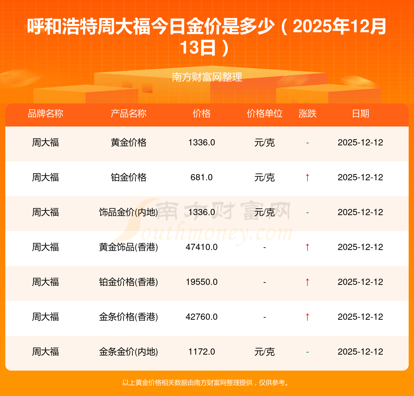 2025年12月13日呼和浩特周大福最新价格:黄金价格1336.0元/克,铂金价格681.0元/克,黄金价格1337.0元/克,铂金价格650.0元/克,黄金价格1339.0元/克,铂金价格600.0元/克,黄金价格1338.0元/克,铂金价格681.0元/克,饰品金价(内地)1336.0元/克,黄金饰品(香港)47410.0,铂金价格(香港)19550.0。