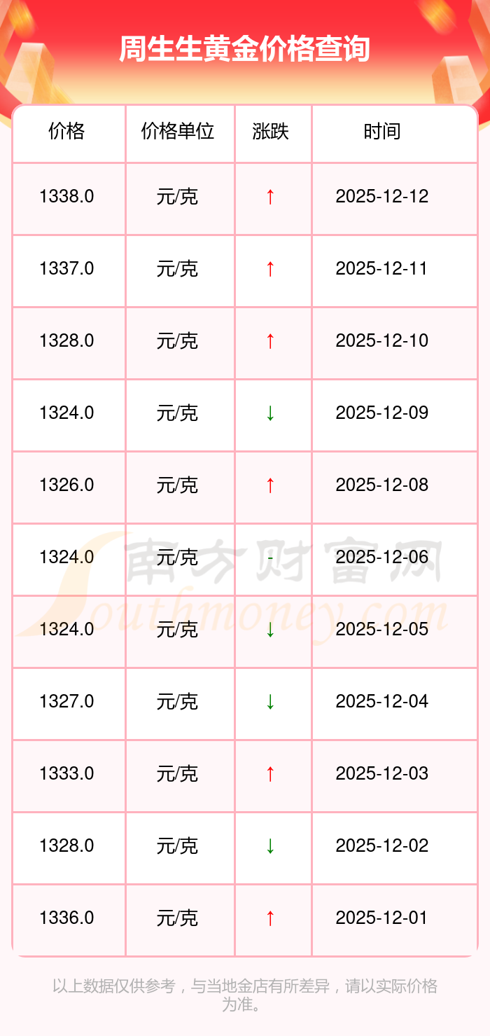 今天黄金价格行情如何?现在一克黄金的售价是多少?一般情况下1克黄金的价格会在多少呢?周生生 黄金价格于今日的最新挂牌价为1338.0元/克。