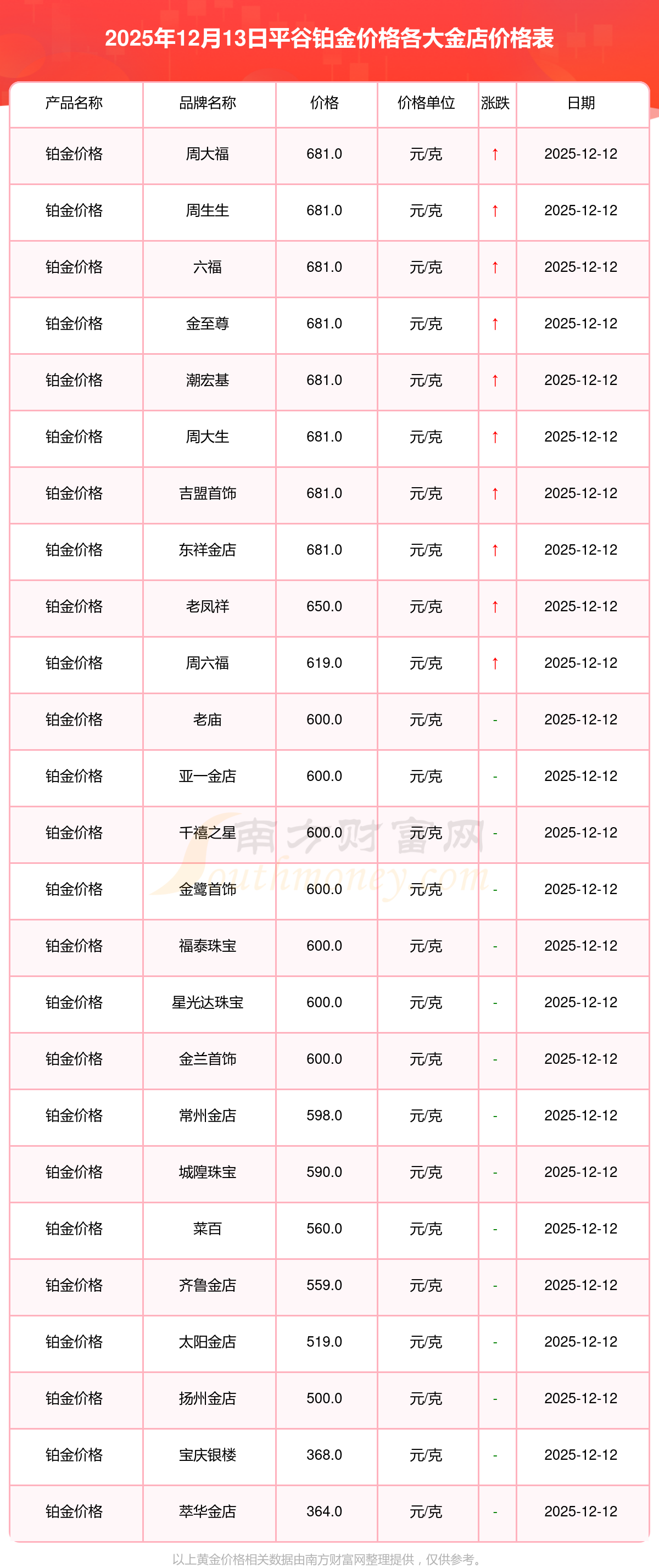 2025年12月13日,平谷周大福、周大福、老凤祥、老凤祥、老庙、老庙、周生生、周生生、周大福、周大福、周大福等各大金店品牌铂金价格今日价格行情最新来了:周大福1336.0元/克、周大福681.0元/克、老凤祥1337.0元/克、老凤祥650.0元/克、老庙1339.0元/克、老庙600.0元/克、周生生1338.0元/克、周生生681.0元/克、周大福1336.0元/克、周大福47410.0、周大福19550.0。