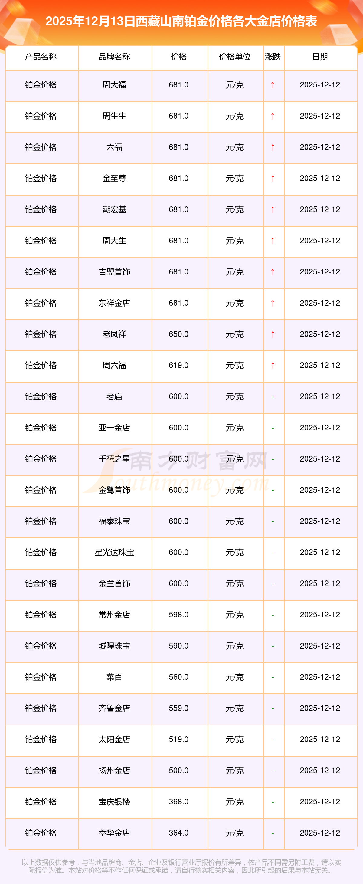 2025年12月13日西藏山南各大金店铂金价格最新价格:周大福1336.0元/克,周大福681.0元/克,老凤祥1337.0元/克,老凤祥650.0元/克,老庙1339.0元/克,老庙600.0元/克,周生生1338.0元/克,周生生681.0元/克,周大福1336.0元/克,周大福47410.0,周大福19550.0。
