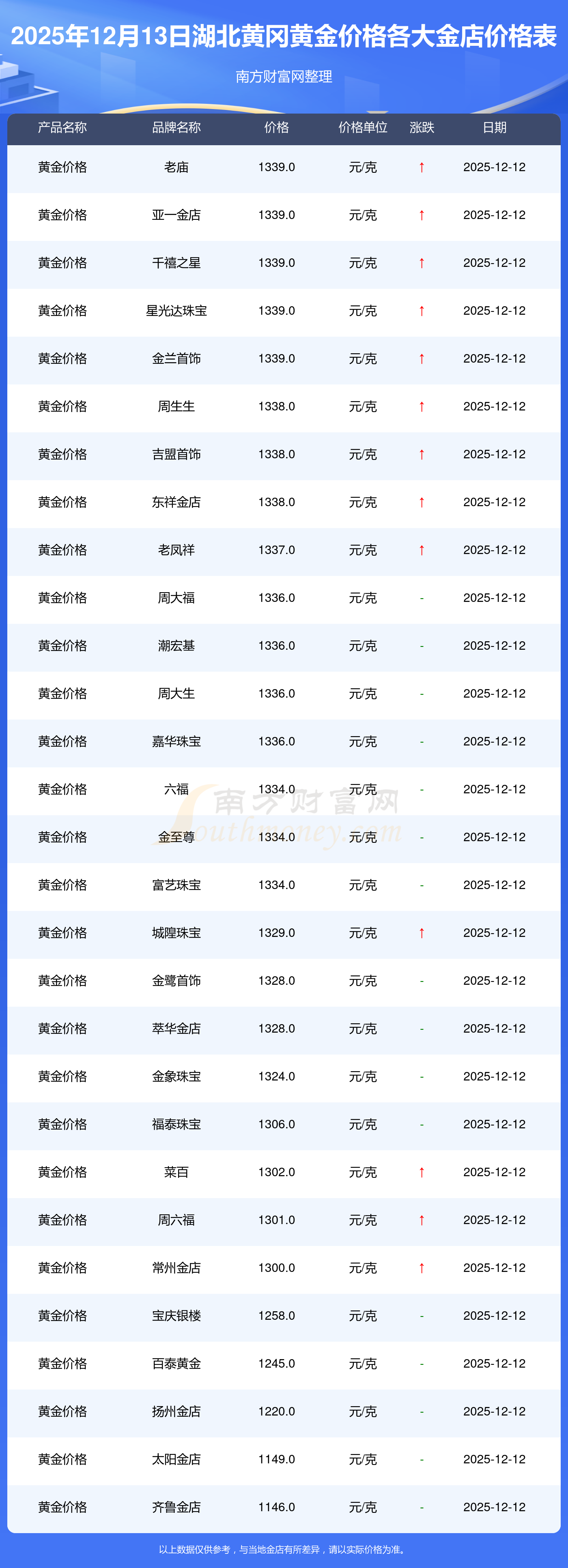 当前,湖北黄冈黄金价格报价区间在1339.0元/克和1146.0元/克之间。最高的为老庙,报价1339.0元/克,最低的为齐鲁金店,报价1146.0元/克。今日黄金价格高低差为193元/克。