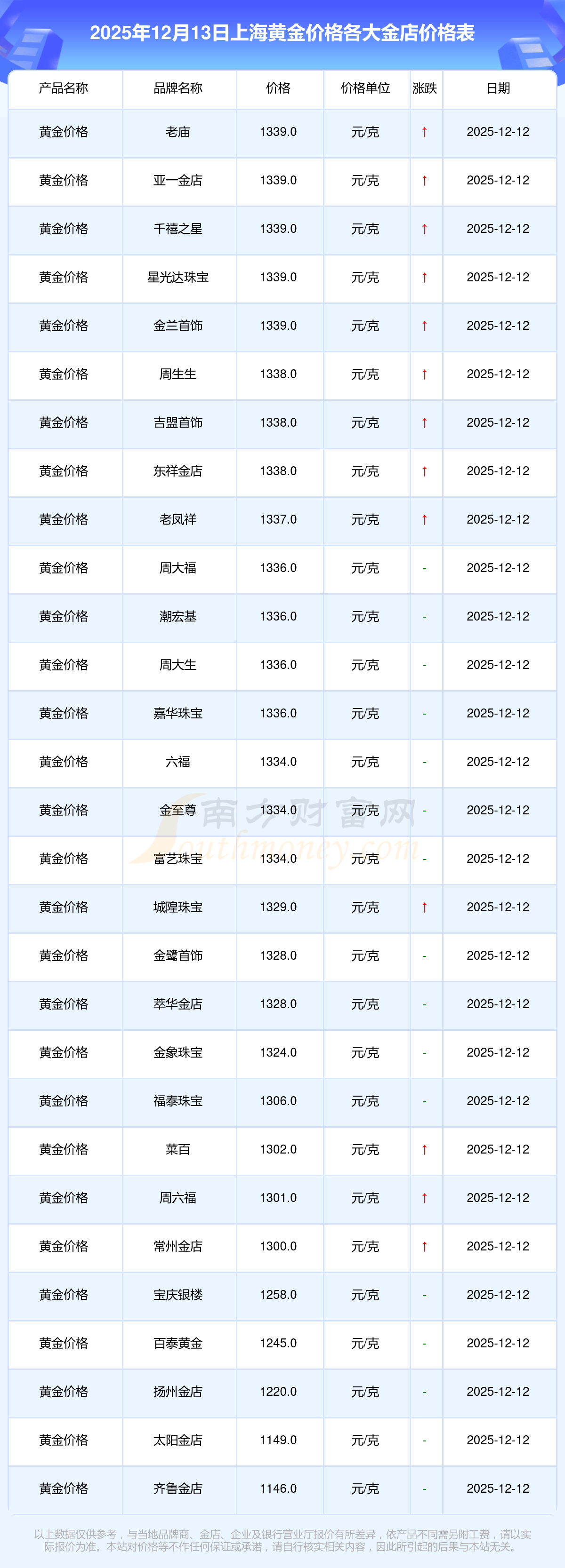 2025年12月13日上海周大福、周大福、老凤祥、老凤祥、老庙、老庙、周生生、周生生、周大福、周大福、周大福等各大金店品牌黄金价格最新价格如下:周大福黄金价格1336.0元/克,周大福铂金价格681.0元/克,老凤祥黄金价格1337.0元/克,老凤祥铂金价格650.0元/克,老庙黄金价格1339.0元/克,老庙铂金价格600.0元/克,周生生黄金价格1338.0元/克,周生生铂金价格681.0元/克,周大福饰品金价(内地)1336.0元/克,周大福黄金饰品(香港)47410.0,周大福铂金价格(香港)19550.0。