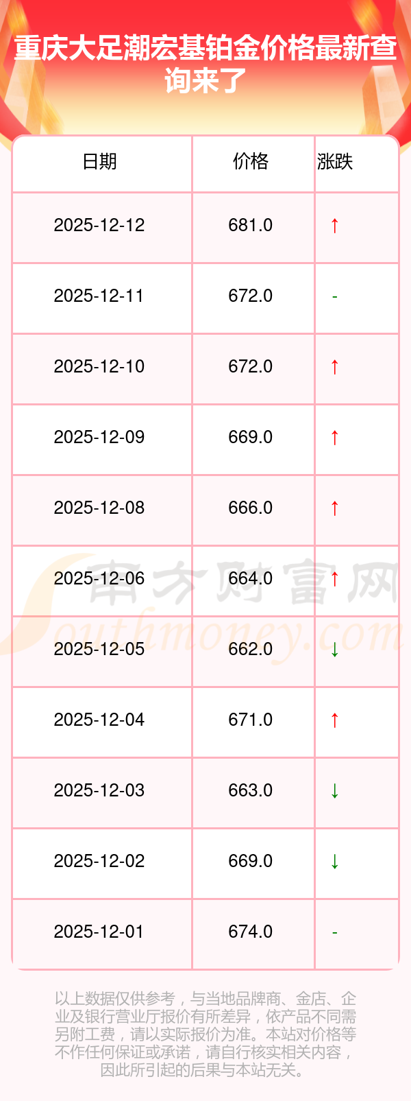 今日2025年12月13日,重庆大足潮宏基铂金价格为681.0元/克。