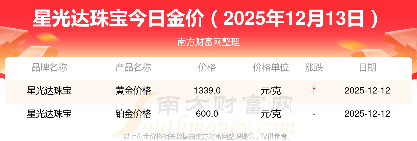 现在星光达珠宝黄金价格是多少钱1克_2025年星光达珠宝今日金价是多少钱一克,最新星光达珠宝查询,2025年12月13日星光达珠宝黄金价格现在每克多少钱?最新星光达珠宝黄金价格报价公布,一起来看看吧!