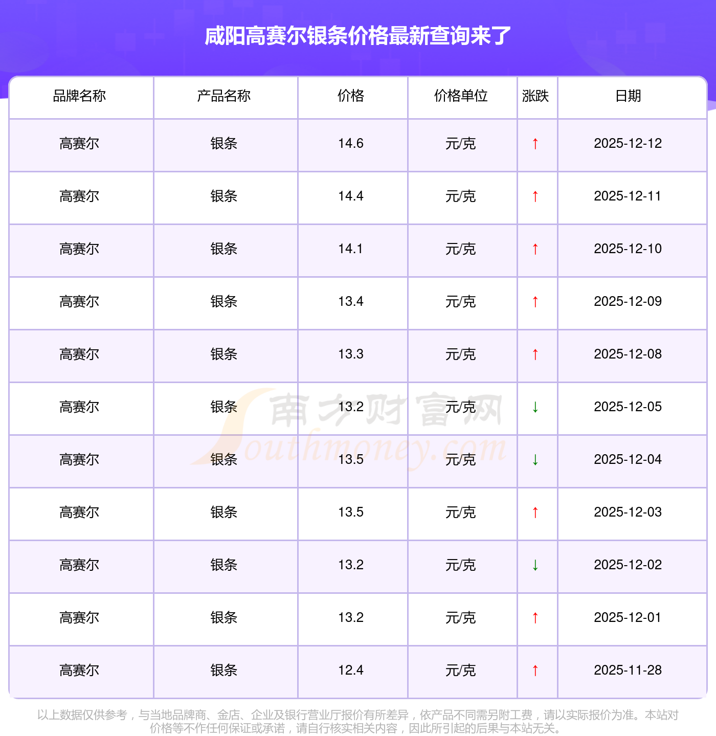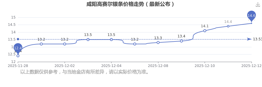 今日(2025年12月13日),咸阳高赛尔银条的定价为 14.6元/克。