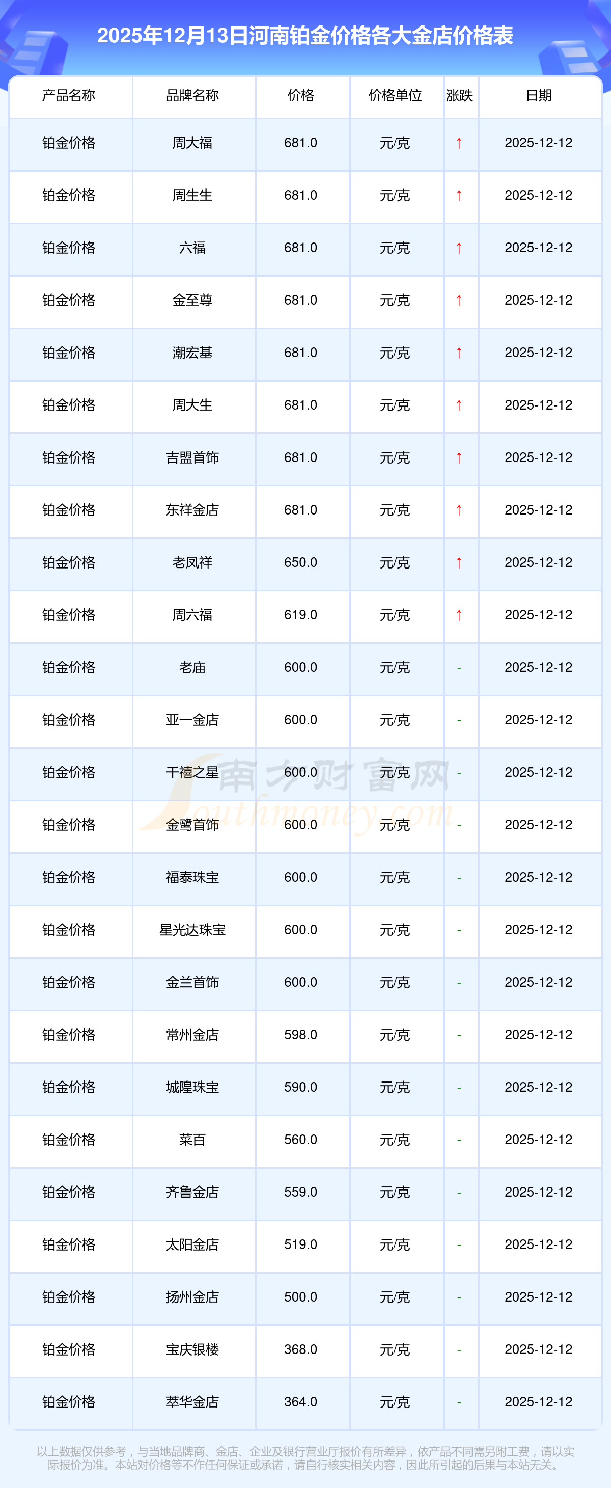 2025年12月13日河南周大福、周大福、老凤祥、老凤祥、老庙、老庙、周生生、周生生、周大福、周大福、周大福等各大金店品牌铂金价格最新价格如下:周大福黄金价格1336.0元/克,周大福铂金价格681.0元/克,老凤祥黄金价格1337.0元/克,老凤祥铂金价格650.0元/克,老庙黄金价格1339.0元/克,老庙铂金价格600.0元/克,周生生黄金价格1338.0元/克,周生生铂金价格681.0元/克,周大福饰品金价(内地)1336.0元/克,周大福黄金饰品(香港)47410.0,周大福铂金价格(香港)19550.0。