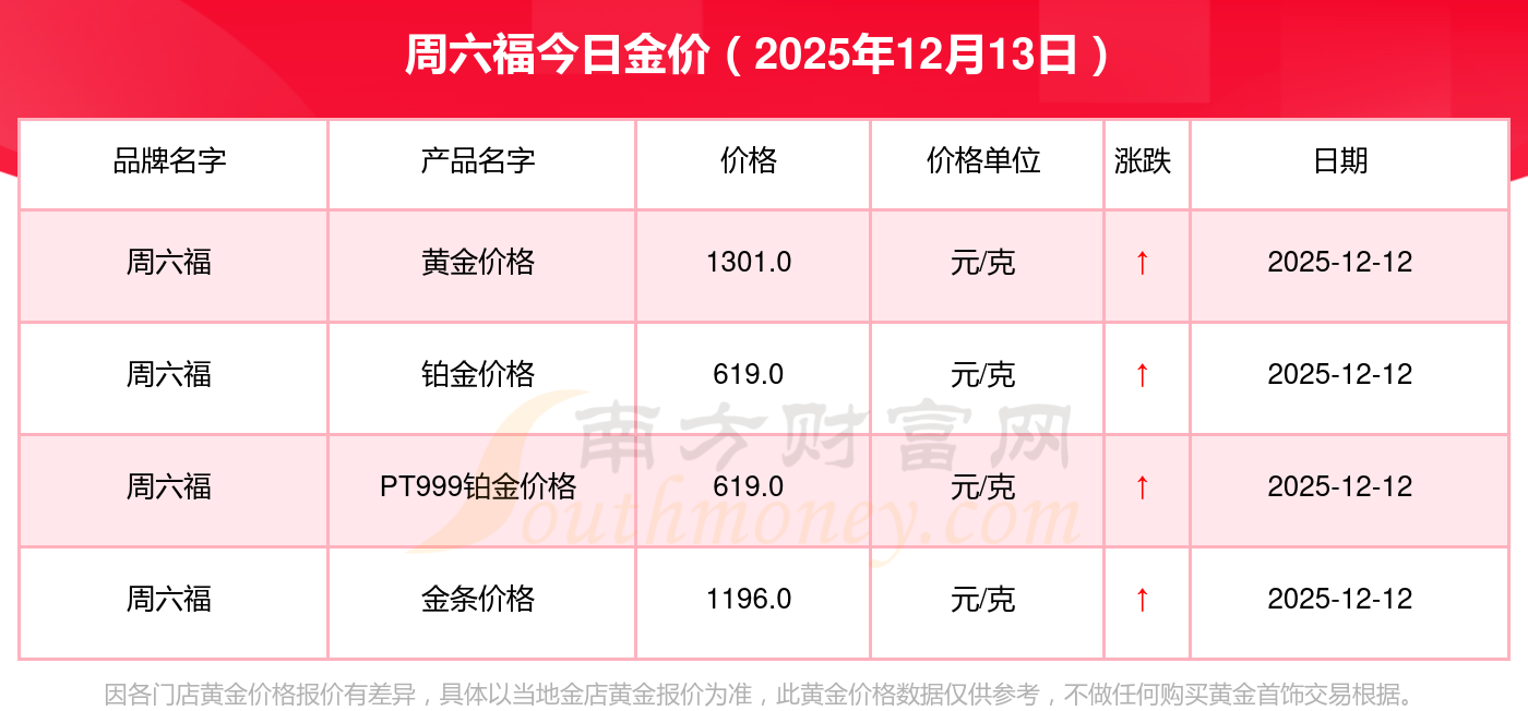 现在周六福黄金价格是多少钱1克_2025年周六福今日金价是多少钱一克,最新周六福查询,2025年12月13日周六福金条价格现在每克多少钱?最新周六福金条价格报价公布,一起来看看吧!