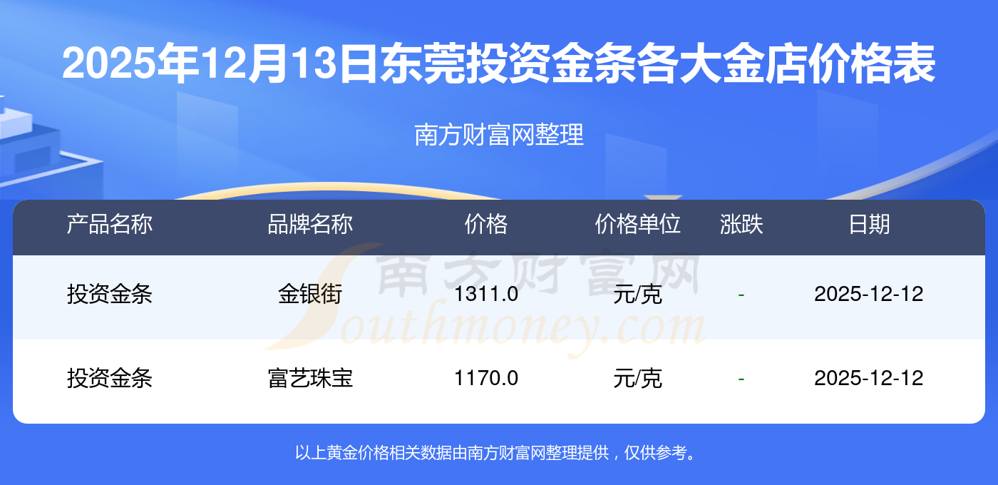 一、东莞各大金店投资金条价格表,2025年12月13日东莞各大金店投资金条价格多少钱一克?
