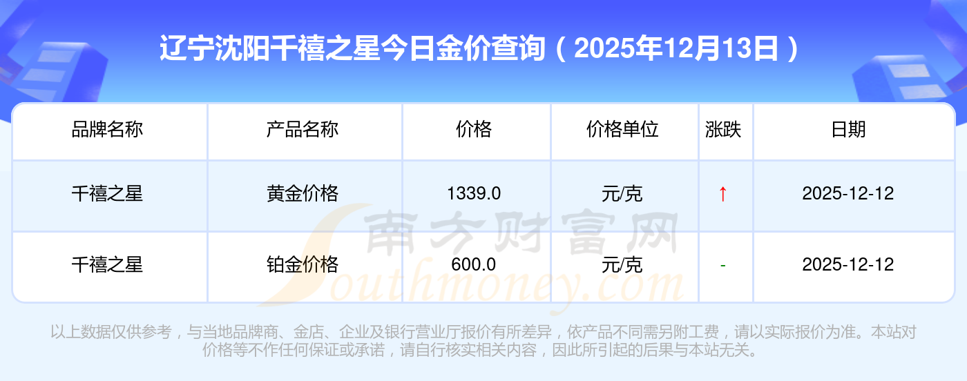 想了解此刻黄金价格,今天黄金一克的售价为多少?2025年12月13日辽宁沈阳千禧之星今日价格:黄金价格1336.0元/克,铂金价格681.0元/克,黄金价格1337.0元/克,铂金价格650.0元/克,黄金价格1339.0元/克,铂金价格600.0元/克,黄金价格1338.0元/克,铂金价格681.0元/克,饰品金价(内地)1336.0元/克,黄金饰品(香港)47410.0,铂金价格(香港)19550.0。