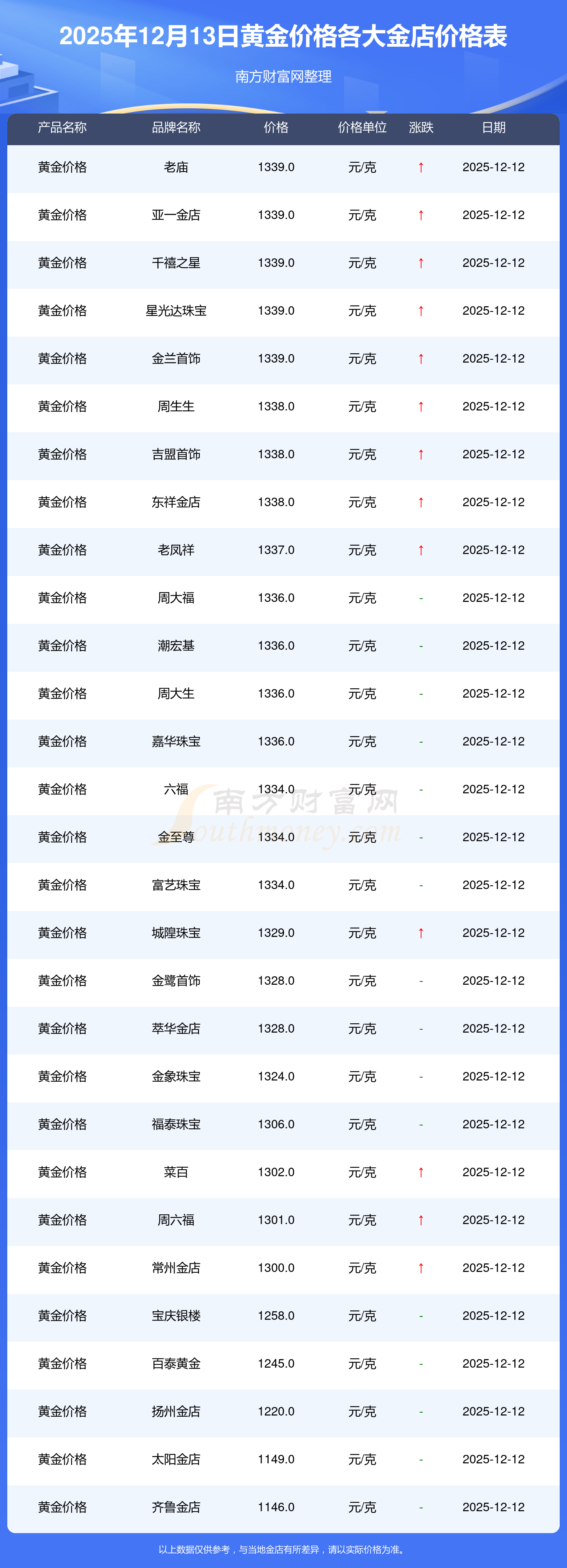 2025年12月13日周大福、周大福、老凤祥、老凤祥、老庙、老庙、周生生、周生生、周大福、周大福、周大福等各大金店品牌黄金价格最新价格如下:周大福黄金价格1336.0元/克,周大福铂金价格681.0元/克,老凤祥黄金价格1337.0元/克,老凤祥铂金价格650.0元/克,老庙黄金价格1339.0元/克,老庙铂金价格600.0元/克,周生生黄金价格1338.0元/克,周生生铂金价格681.0元/克,周大福饰品金价(内地)1336.0元/克,周大福黄金饰品(香港)47410.0,周大福铂金价格(香港)19550.0。