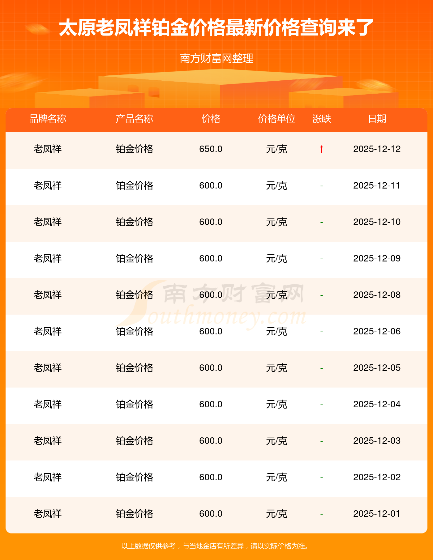 2025年12月13日这一天,太原老凤祥的铂金价格以 650.0元/克的价格售卖。