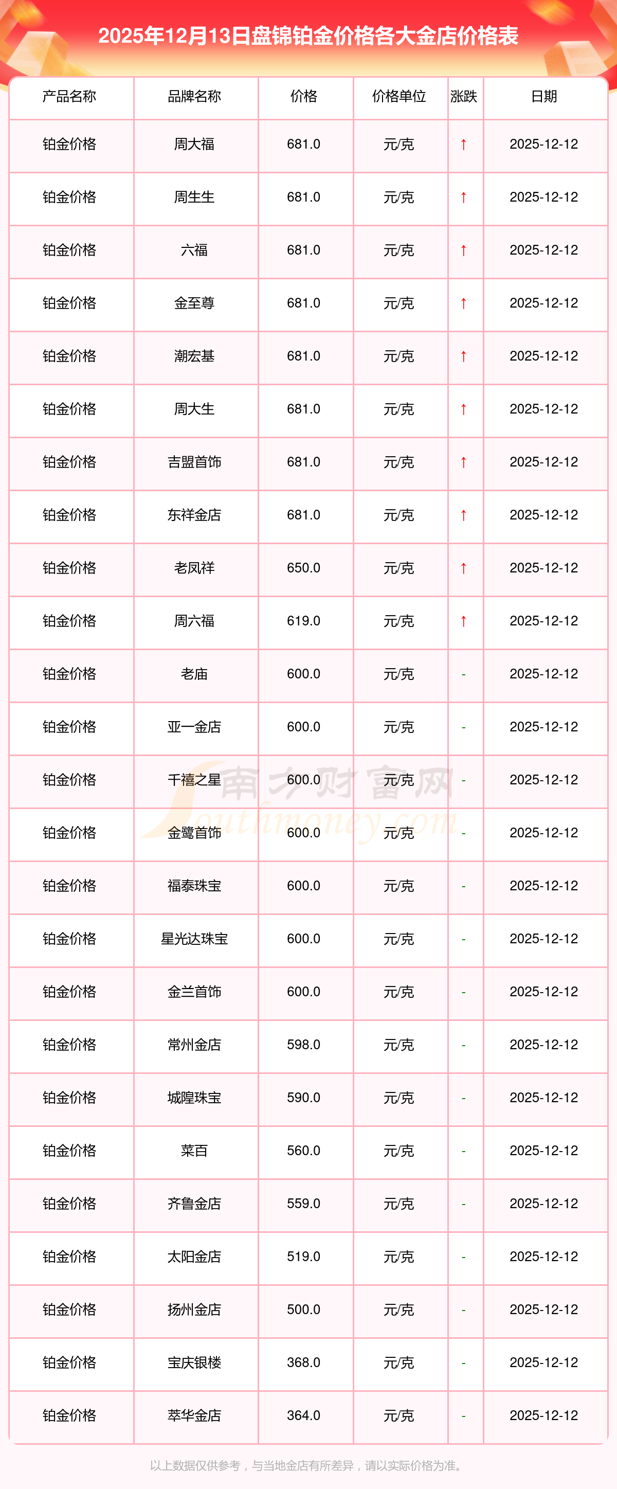 2025年12月13日盘锦各大金店铂金价格最新价格查询来了:周大福1336.0元/克,周大福681.0元/克,老凤祥1337.0元/克,老凤祥650.0元/克,老庙1339.0元/克,老庙600.0元/克,周生生1338.0元/克,周生生681.0元/克,周大福1336.0元/克,周大福47410.0,周大福19550.0。