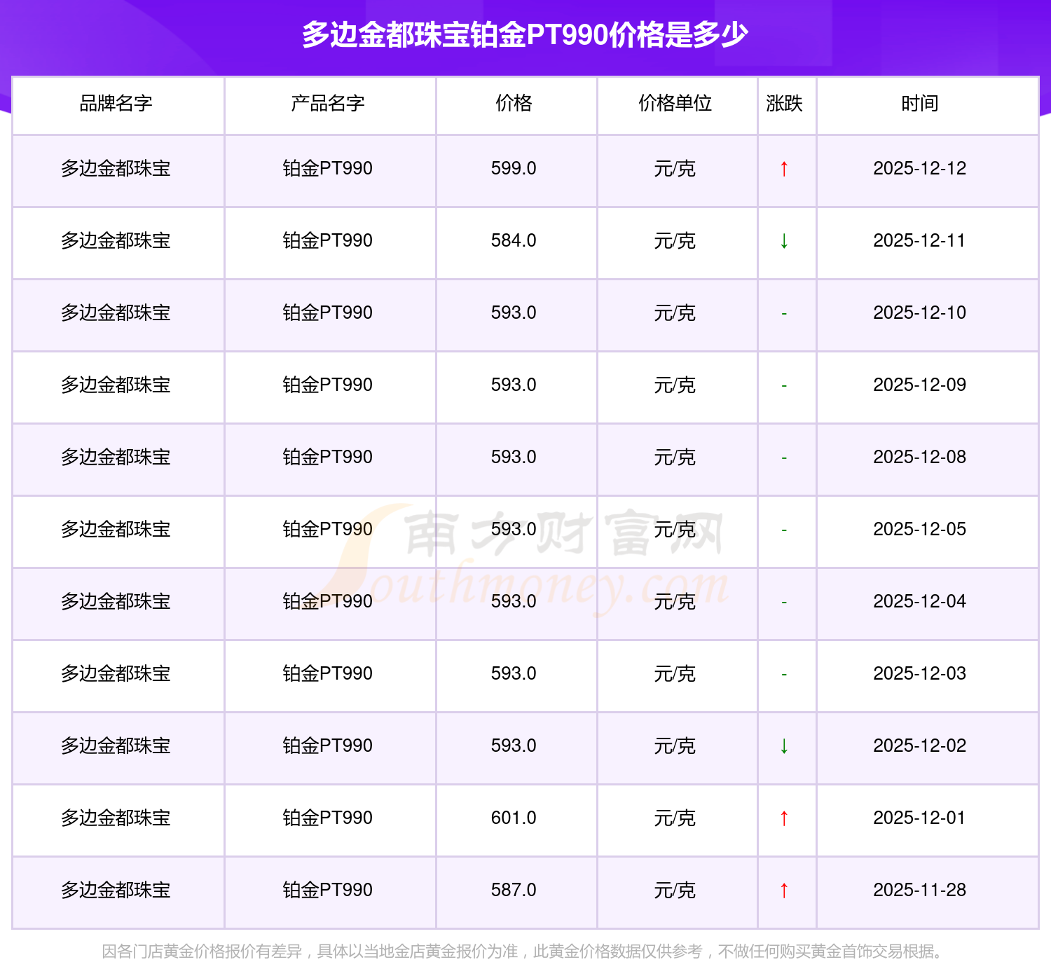 599.0元/克是多边金都珠宝在今日给出的 铂金PT990最新价格。