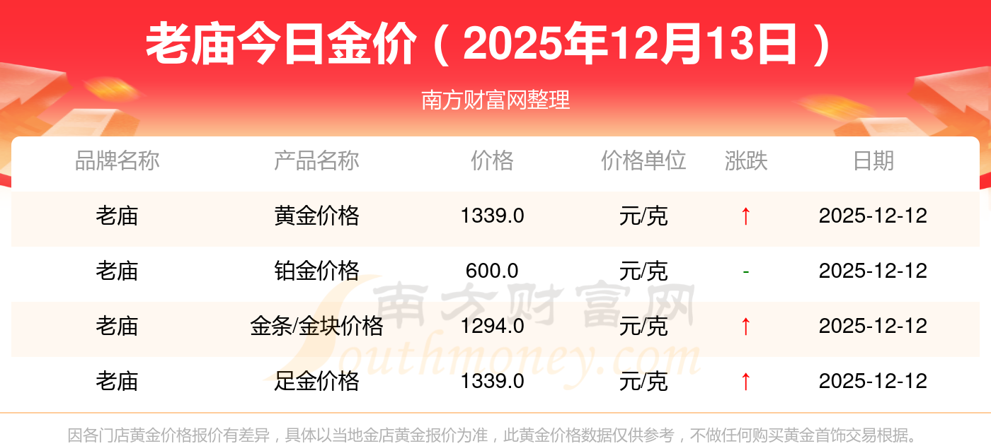 2025年12月13日老庙最新价格:黄金价格1336.0元/克,铂金价格681.0元/克,黄金价格1337.0元/克,铂金价格650.0元/克,黄金价格1339.0元/克,铂金价格600.0元/克,黄金价格1338.0元/克,铂金价格681.0元/克,饰品金价(内地)1336.0元/克,黄金饰品(香港)47410.0,铂金价格(香港)19550.0。