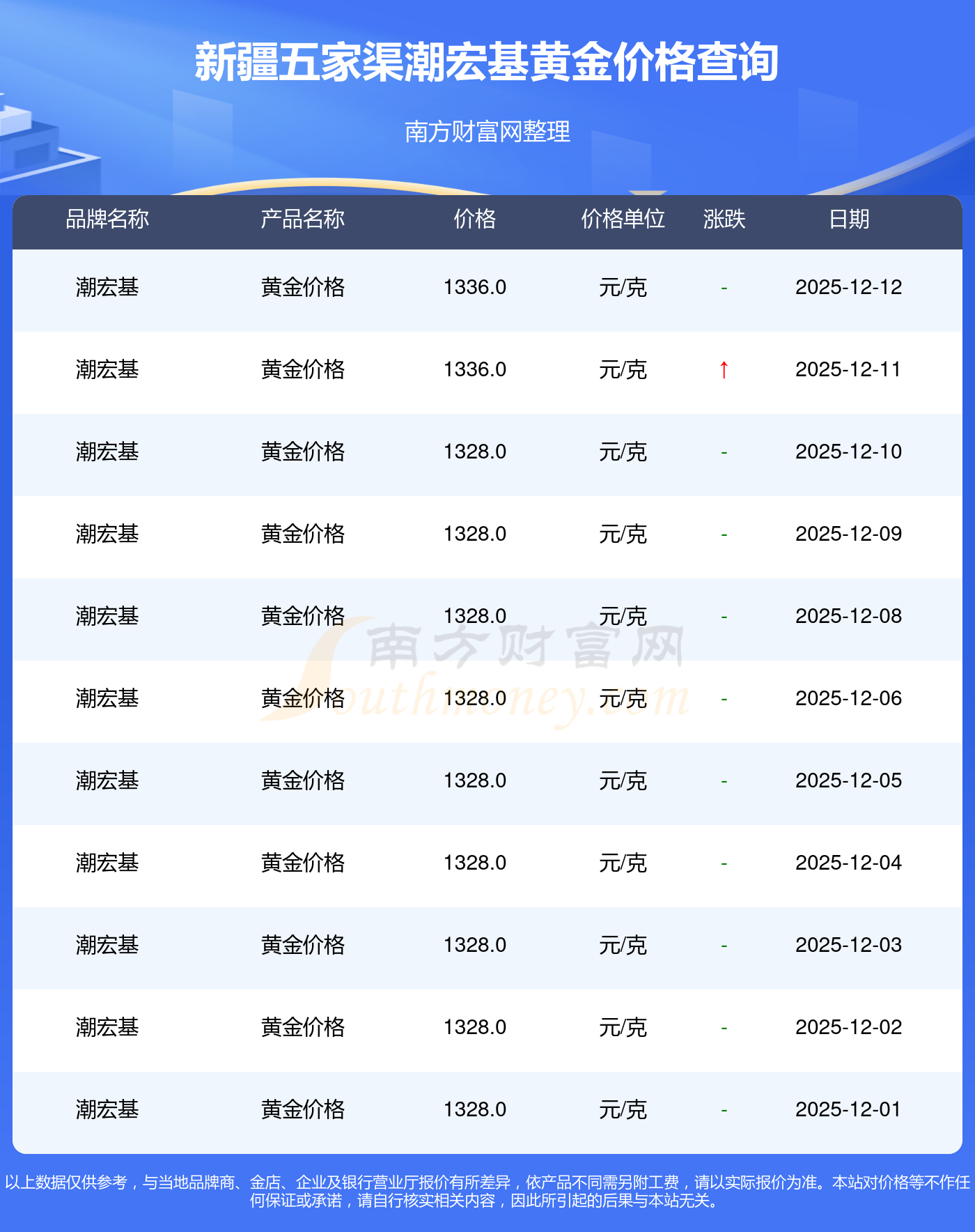 2025年12月13日,新疆五家渠潮宏基黄金价格每克的售卖价位为1336.0元/克。