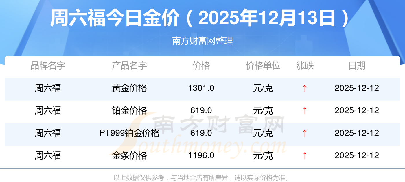 2025年12月13日周大福、周大福、老凤祥、老凤祥、老庙、老庙、周生生、周生生、周大福、周大福、周大福等各大金店品牌黄金价格最新价格如下:周大福黄金价格1336.0元/克,周大福铂金价格681.0元/克,老凤祥黄金价格1337.0元/克,老凤祥铂金价格650.0元/克,老庙黄金价格1339.0元/克,老庙铂金价格600.0元/克,周生生黄金价格1338.0元/克,周生生铂金价格681.0元/克,周大福饰品金价(内地)1336.0元/克,周大福黄金饰品(香港)47410.0,周大福铂金价格(香港)19550.0。