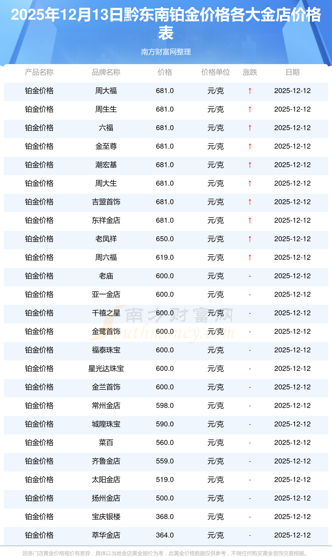 2025年12月13日黔东南各大金店铂金价格最新价格查询来了:周大福1336.0元/克,周大福681.0元/克,老凤祥1337.0元/克,老凤祥650.0元/克,老庙1339.0元/克,老庙600.0元/克,周生生1338.0元/克,周生生681.0元/克,周大福1336.0元/克,周大福47410.0,周大福19550.0。