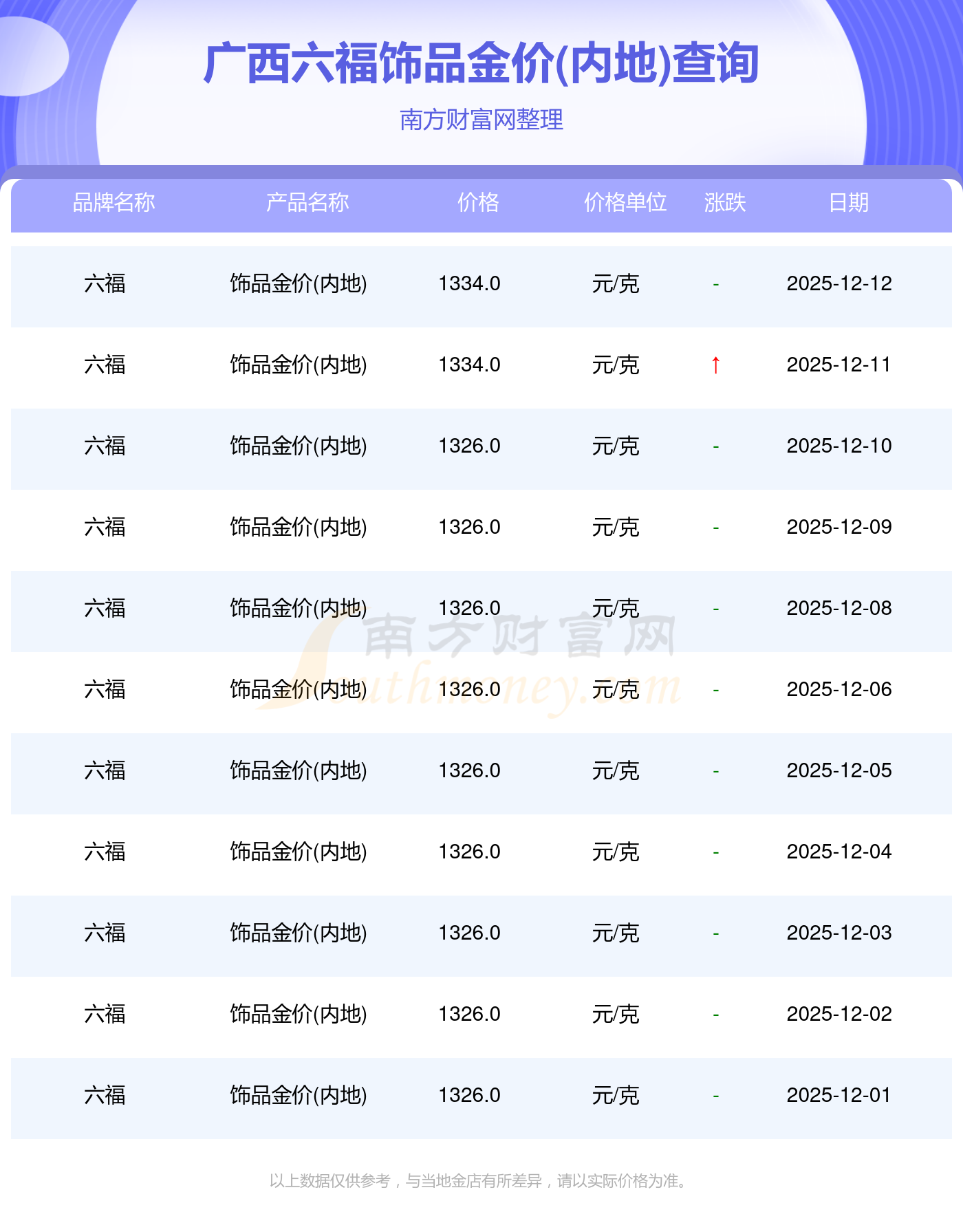 广西六福 2025年12月13日的饰品金价(内地)价位为 1334.0元/克。