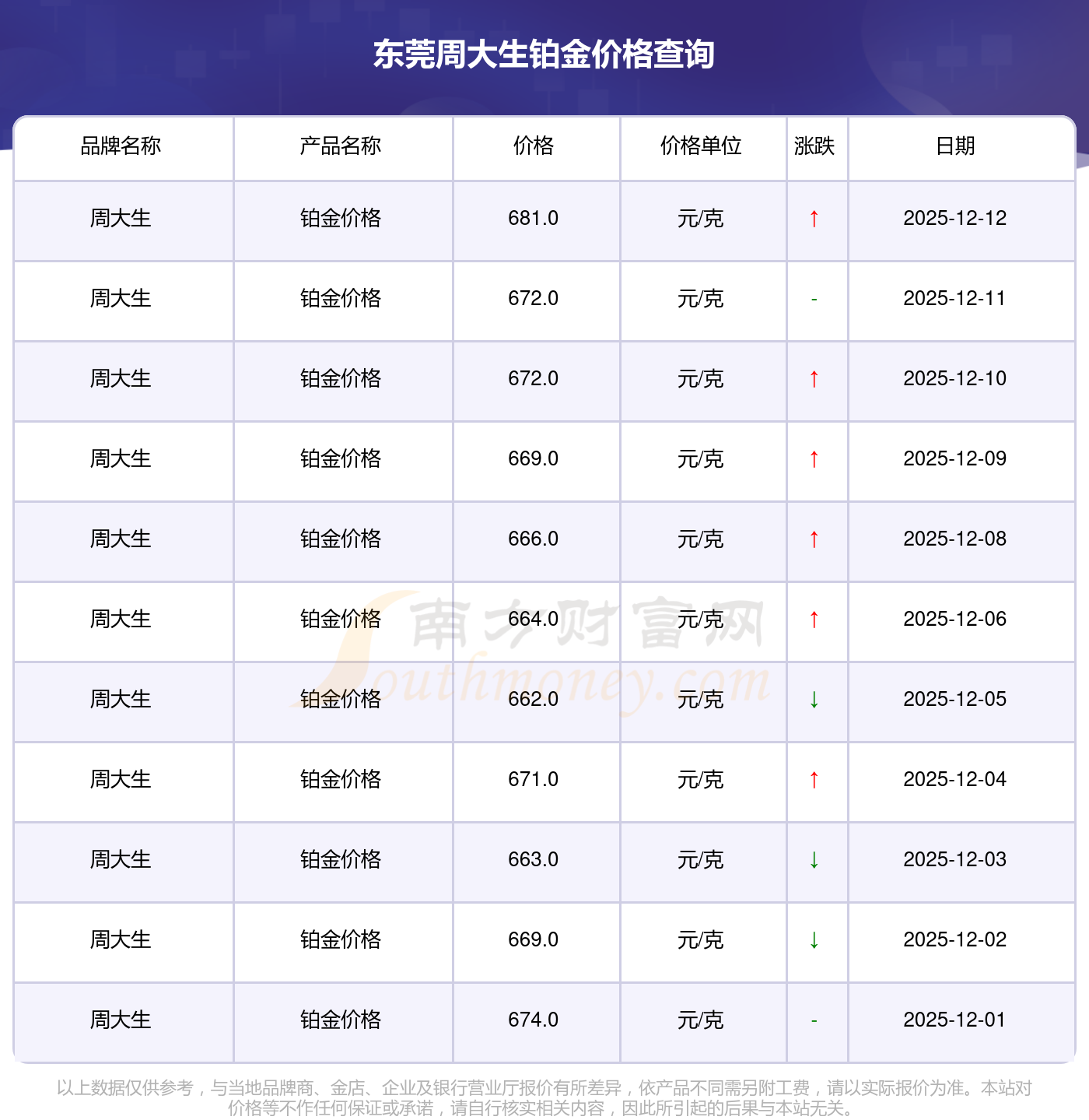2025年12月13日这一天,东莞周大生的铂金价格以 681.0元/克的价格售卖。