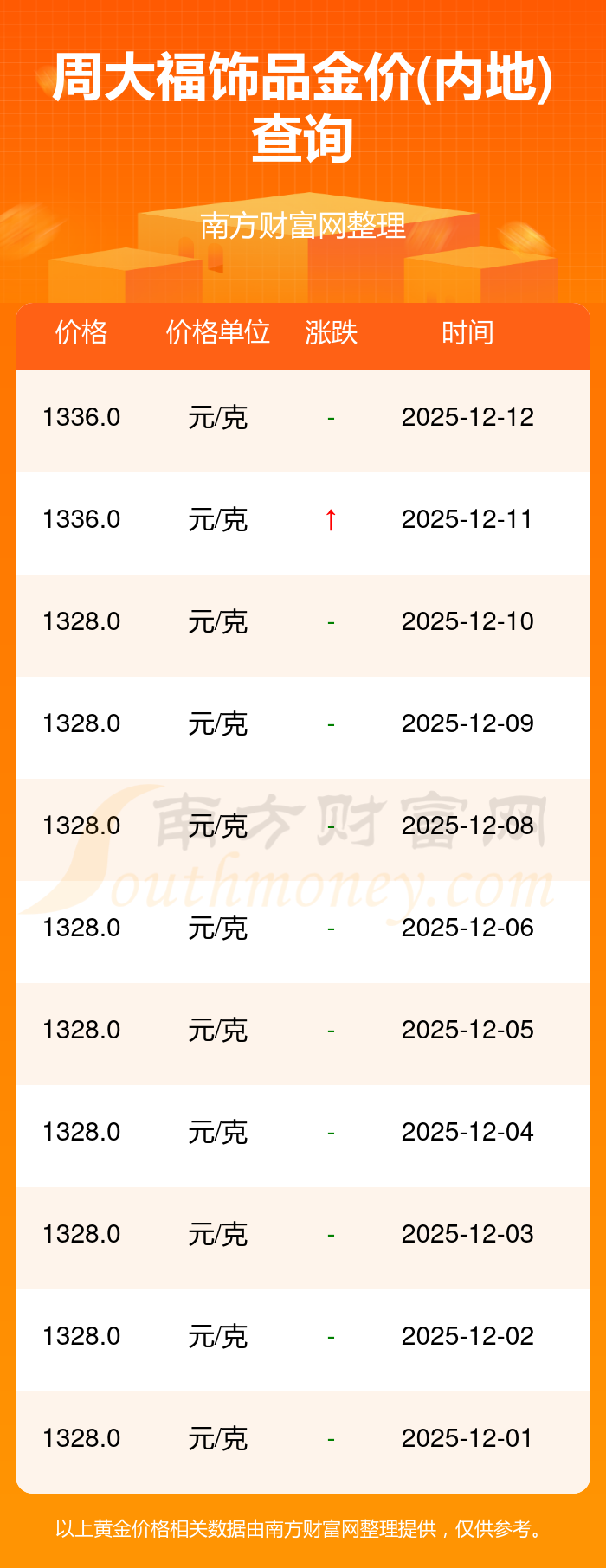 1336.0元/克成为周大福今日 饰品金价(内地)的最新交易的价格。