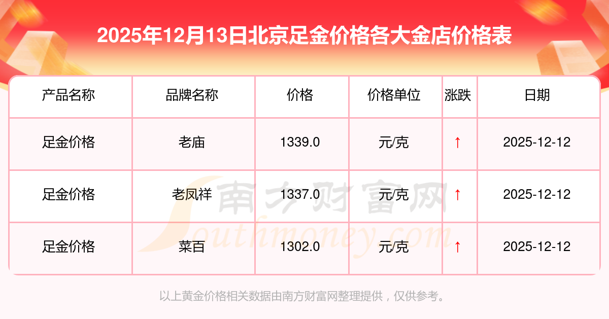 2025年12月13日北京周大福、周大福、老凤祥、老凤祥、老庙、老庙、周生生、周生生、周大福、周大福、周大福等各大金店品牌足金价格最新价格如下:周大福黄金价格1336.0元/克,周大福铂金价格681.0元/克,老凤祥黄金价格1337.0元/克,老凤祥铂金价格650.0元/克,老庙黄金价格1339.0元/克,老庙铂金价格600.0元/克,周生生黄金价格1338.0元/克,周生生铂金价格681.0元/克,周大福饰品金价(内地)1336.0元/克,周大福黄金饰品(香港)47410.0,周大福铂金价格(香港)19550.0。