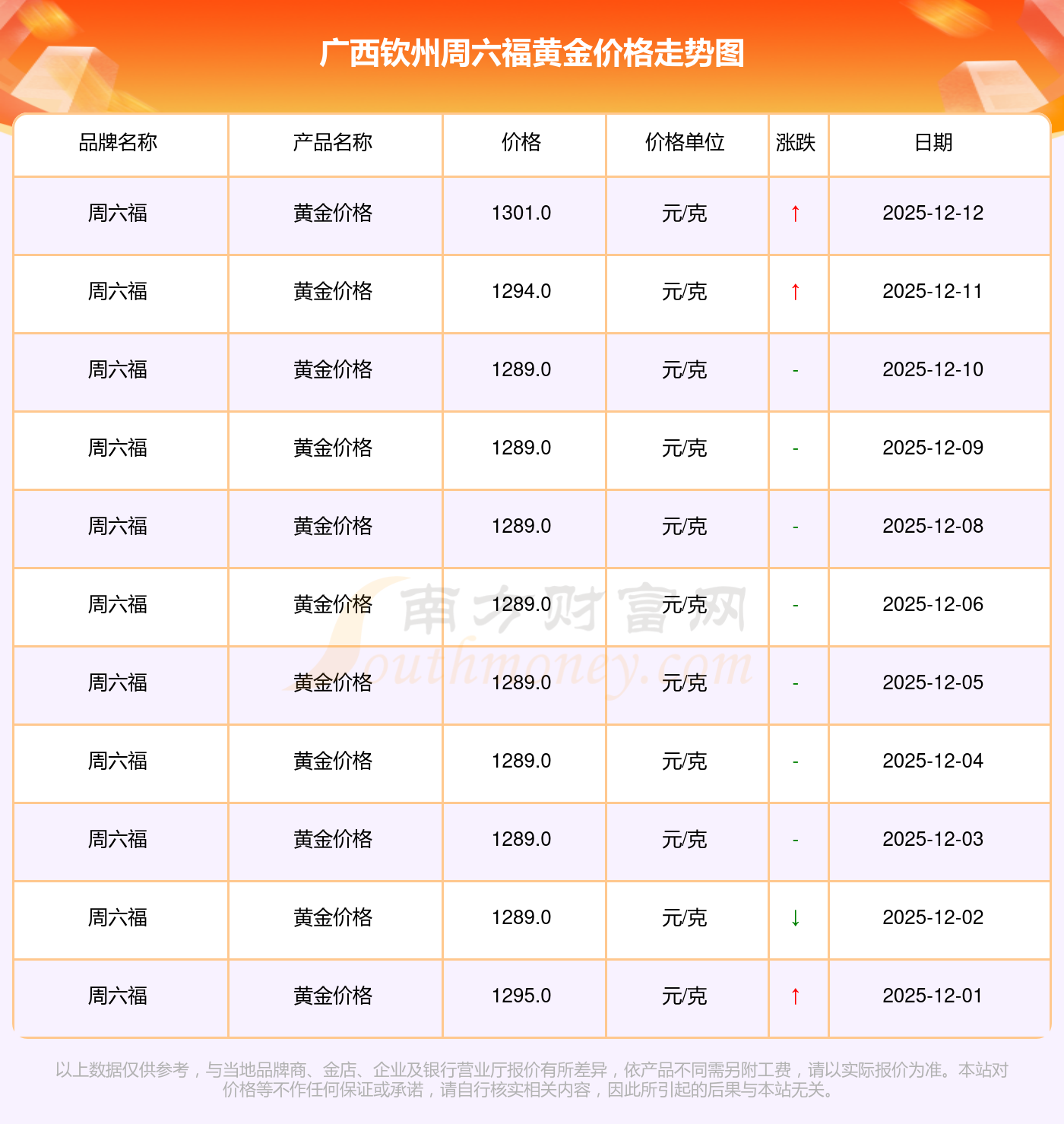 广西钦州周六福在 2025年12月13日,黄金价格的售卖价格是 1301.0元/克。