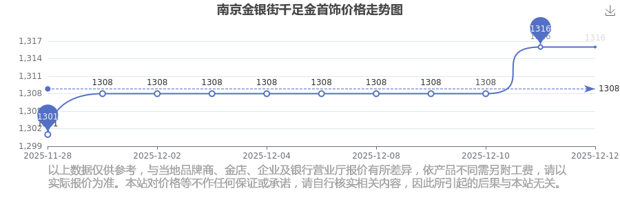 今日(2025年12月13日),南京金银街千足金首饰的定价为 1316.0元/克。
