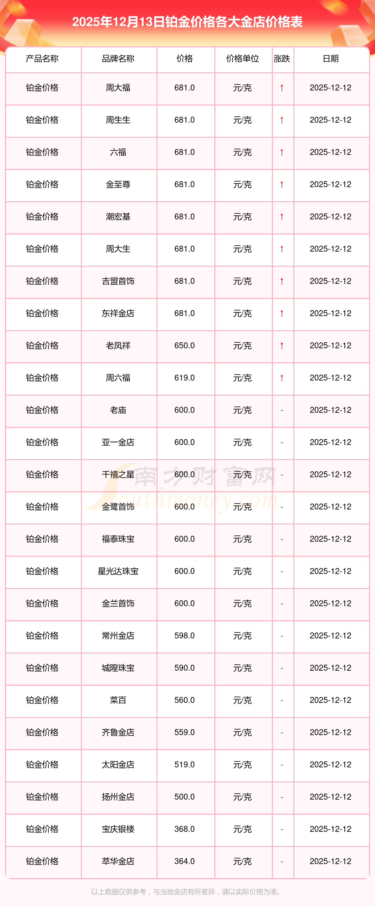 2025年12月13日各大金店铂金价格最新价格:周大福1336.0元/克,周大福681.0元/克,老凤祥1337.0元/克,老凤祥650.0元/克,老庙1339.0元/克,老庙600.0元/克,周生生1338.0元/克,周生生681.0元/克,周大福1336.0元/克,周大福47410.0,周大福19550.0。