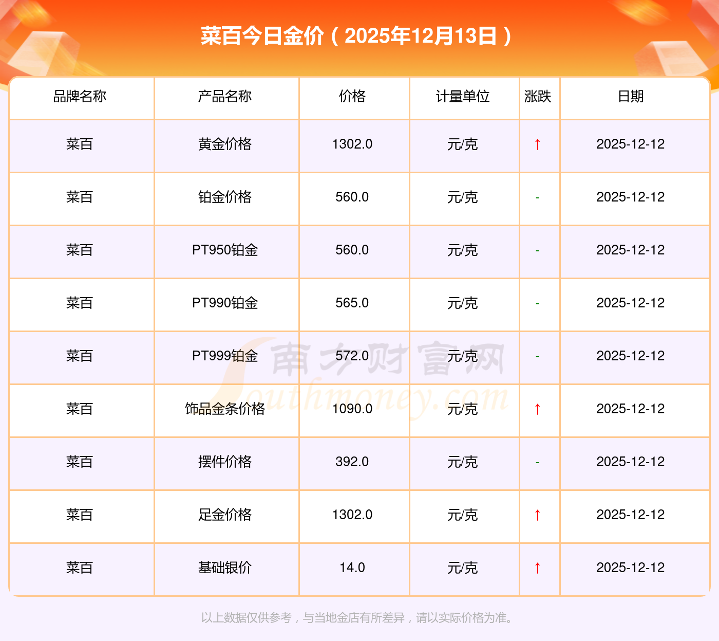 2025年12月13日,周大福、周大福、老凤祥、老凤祥、老庙、老庙、周生生、周生生、周大福、周大福、周大福等各大金店品牌PT990铂金今日价格如下:周大福1336.0元/克、周大福681.0元/克、老凤祥1337.0元/克、老凤祥650.0元/克、老庙1339.0元/克、老庙600.0元/克、周生生1338.0元/克、周生生681.0元/克、周大福1336.0元/克、周大福47410.0、周大福19550.0。