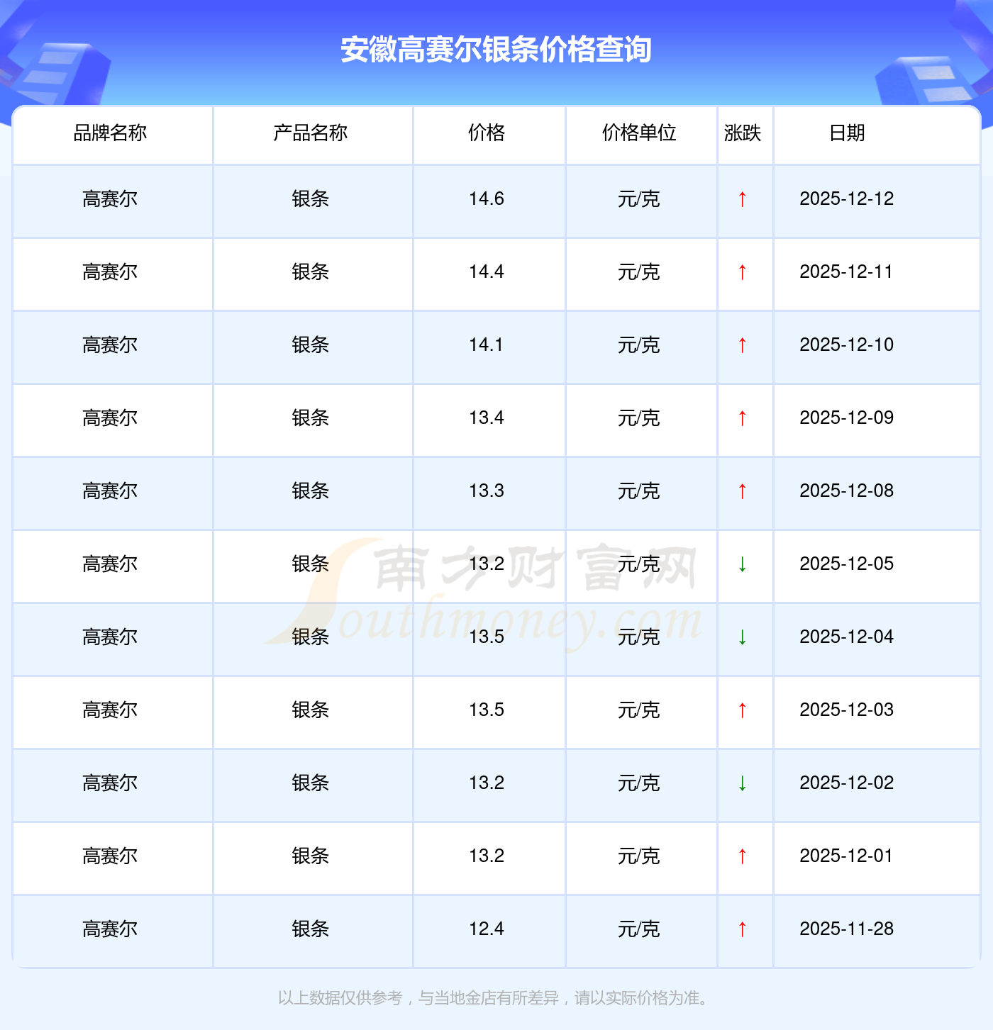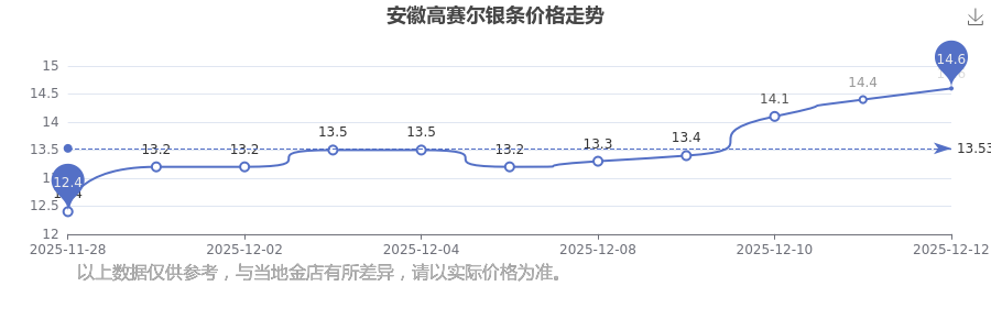 安徽高赛尔在 2025年12月13日的银条零售价格为 14.6元/克。