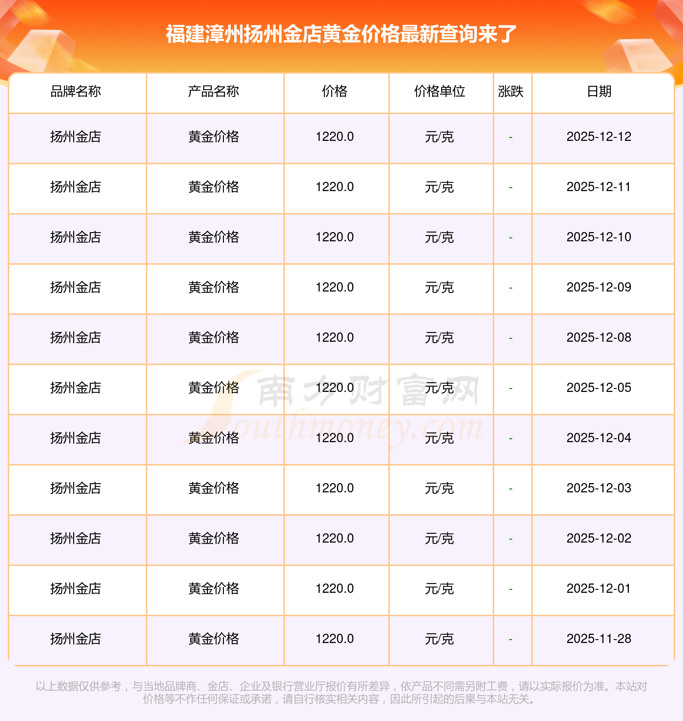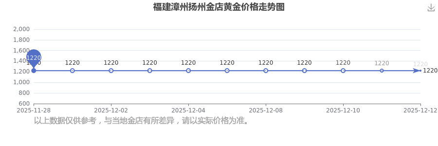 今日(2025年12月13日)福建漳州扬州金店黄金价格:1220.0元/克。