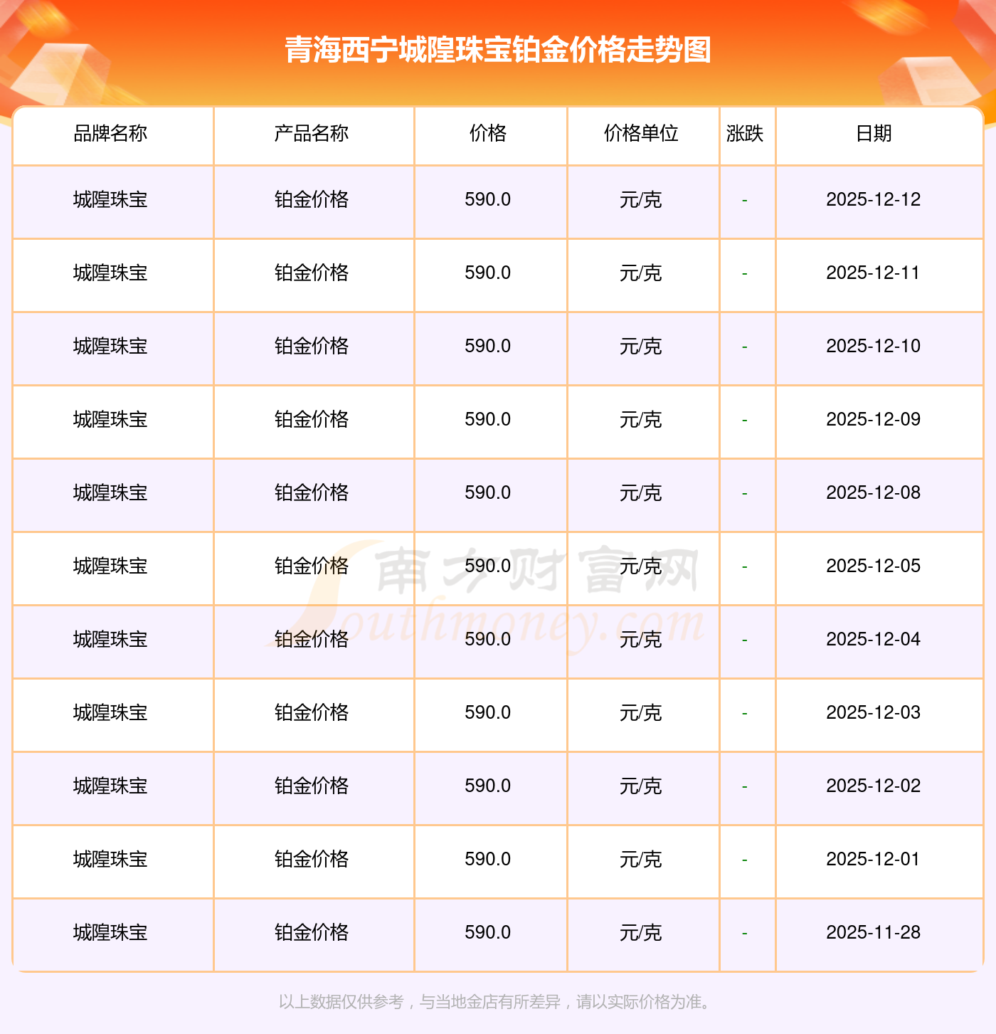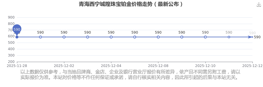 今日(2025年12月13日),青海西宁城隍珠宝铂金价格:590.0元/克。