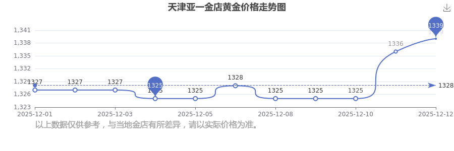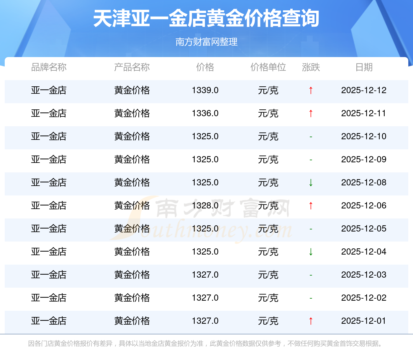 于 2025年12月13日,天津亚一金店黄金价格的克价为1339.0元/克。