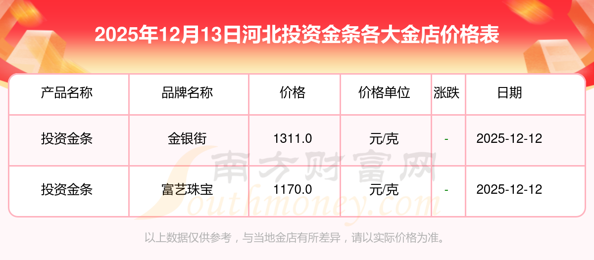 据了解到,今日河北投资金条报价最高的金店是金银街,为1311.0元/克,报价最低的金店是富艺珠宝,为1170.0元/克。今日投资金条高低差为141元/克。