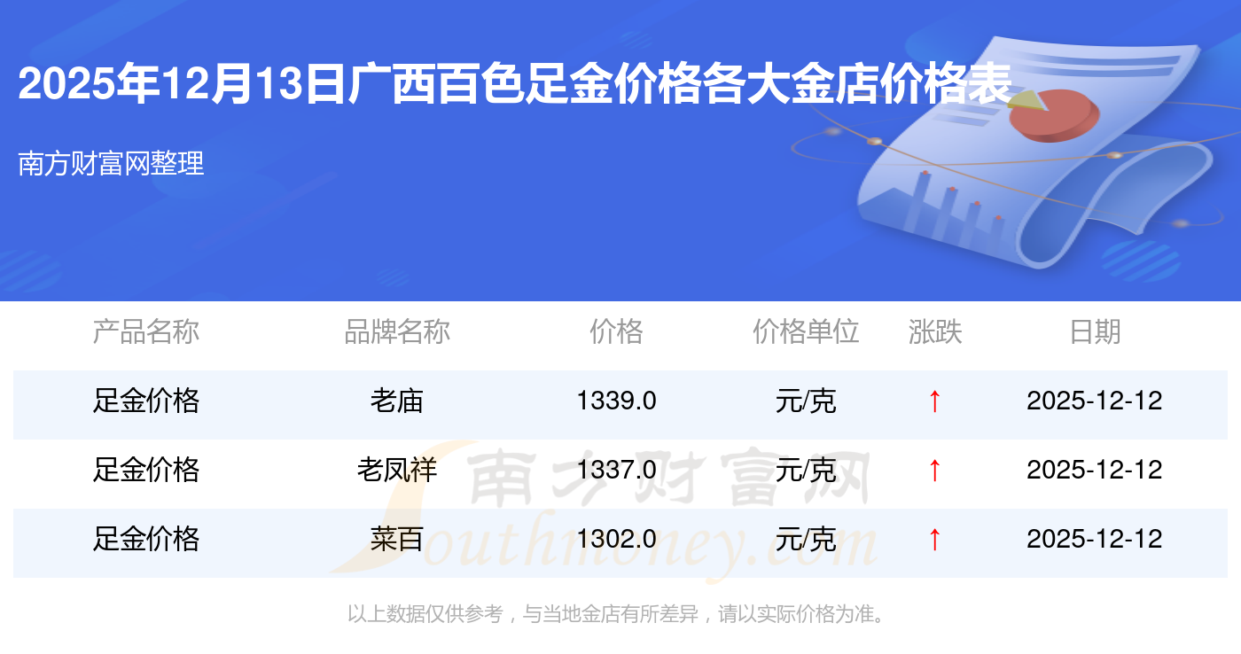 2025年12月13日广西百色各大金店足金价格最新价格:周大福1336.0元/克,周大福681.0元/克,老凤祥1337.0元/克,老凤祥650.0元/克,老庙1339.0元/克,老庙600.0元/克,周生生1338.0元/克,周生生681.0元/克,周大福1336.0元/克,周大福47410.0,周大福19550.0。