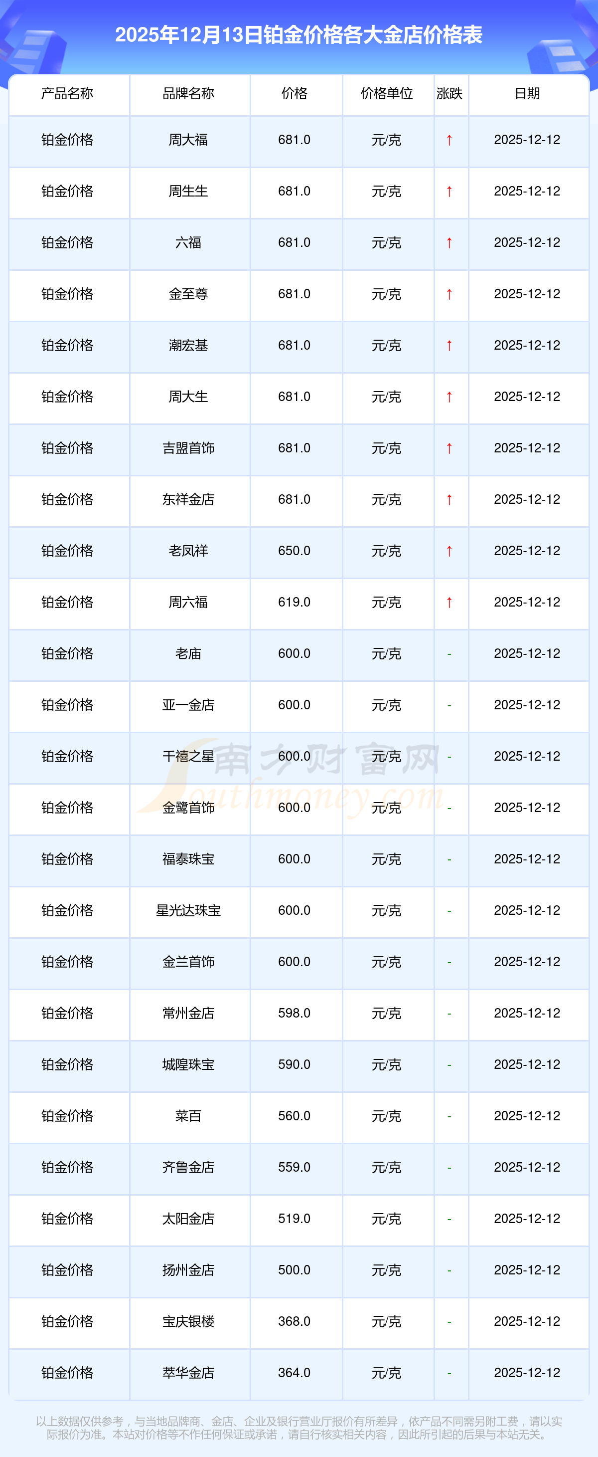今日各金店铂金价格多少钱一克(2025年12月13日铂金价格汇总),随小编来看看。