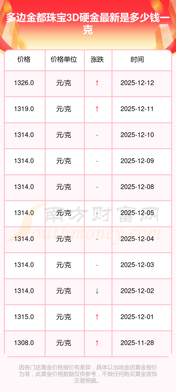 今日多边金都珠宝3D硬金的价格是1326.0元/克。