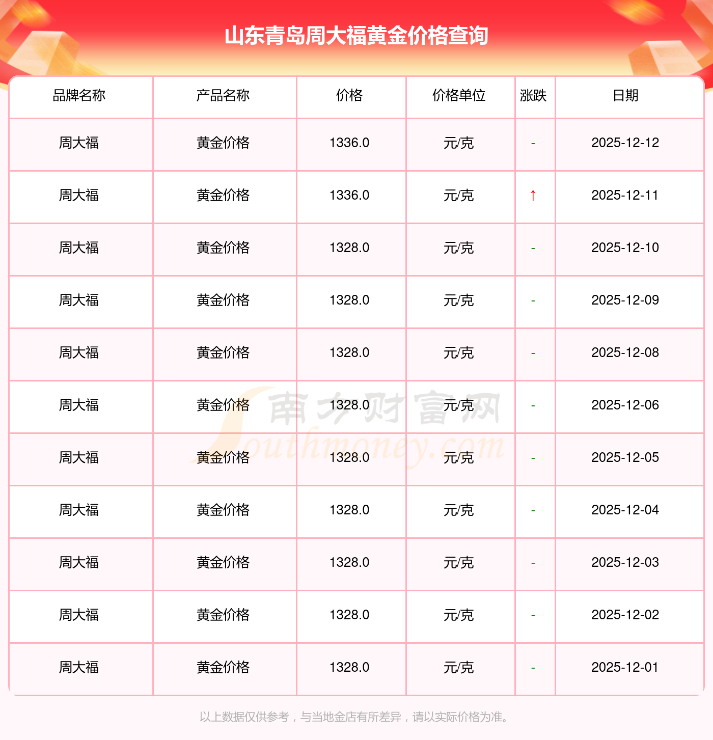 今日山东青岛周大福黄金价格为1336.0元/克。