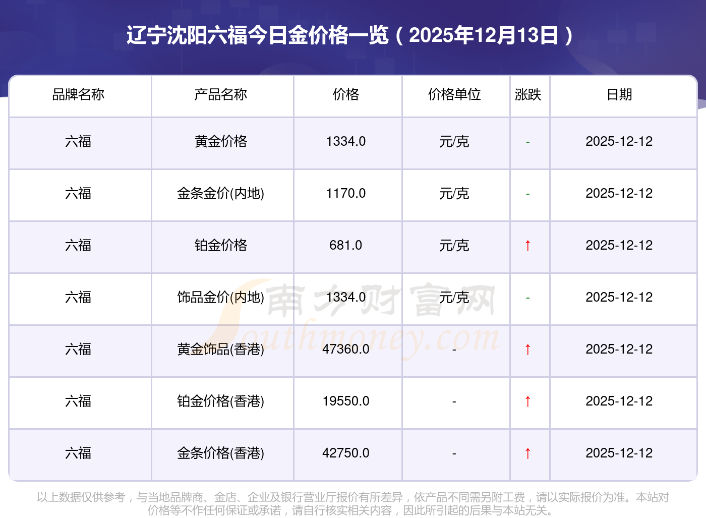 2025年12月13日辽宁沈阳六福今日价格:黄金价格1336.0元/克,铂金价格681.0元/克,黄金价格1337.0元/克,铂金价格650.0元/克,黄金价格1339.0元/克,铂金价格600.0元/克,黄金价格1338.0元/克,铂金价格681.0元/克,饰品金价(内地)1336.0元/克,黄金饰品(香港)47410.0,铂金价格(香港)19550.0。