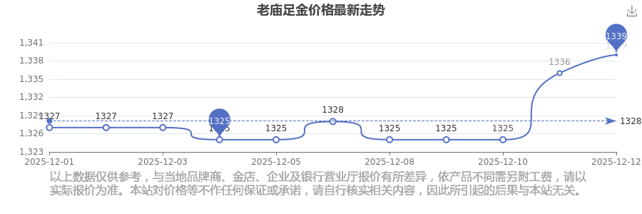 想知道当下黄金价格,今天黄金一克卖多少钱呢?黄金是一种优良的导电导热材料,具有良好的导热特性。黄金常用于电子工业中的特殊电路设计,因其化学稳定性高、抗氧化性强,可制作高精度电子元件。2025年12月13日老庙足金价格查询:1339.0元/克。