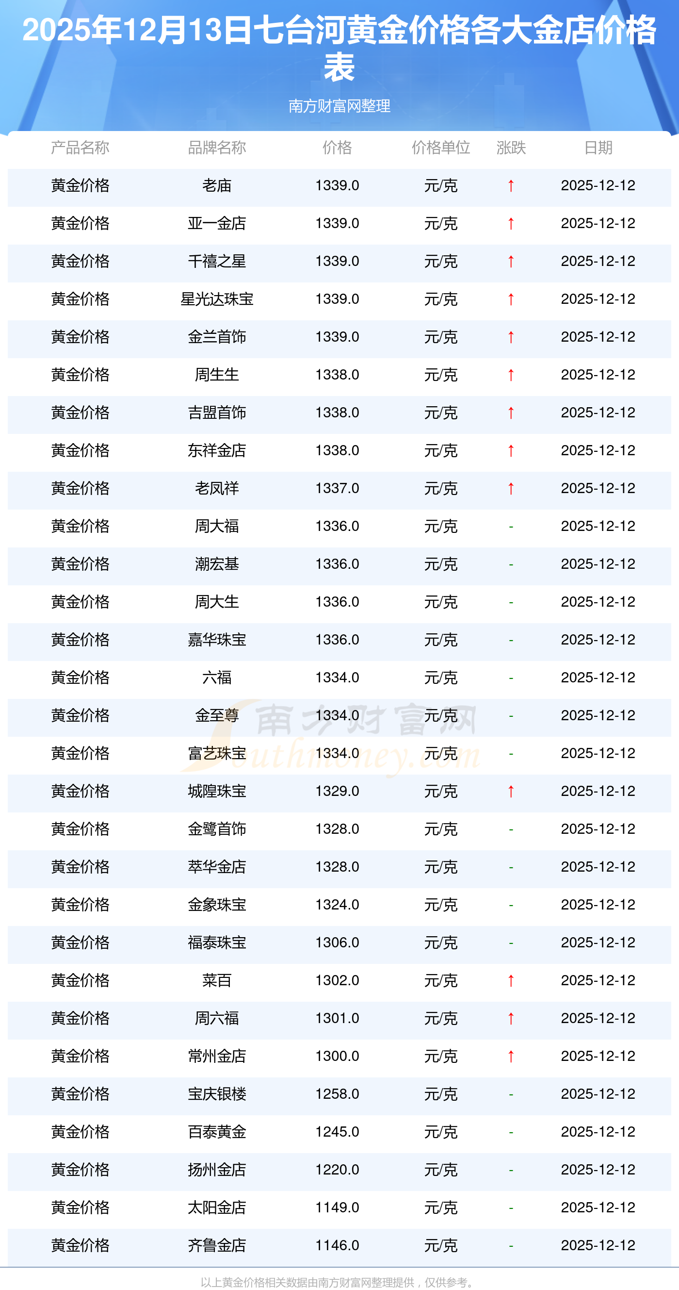 2025年12月13日七台河各大金店黄金价格最新价格:周大福1336.0元/克,周大福681.0元/克,老凤祥1337.0元/克,老凤祥650.0元/克,老庙1339.0元/克,老庙600.0元/克,周生生1338.0元/克,周生生681.0元/克,周大福1336.0元/克,周大福47410.0,周大福19550.0。