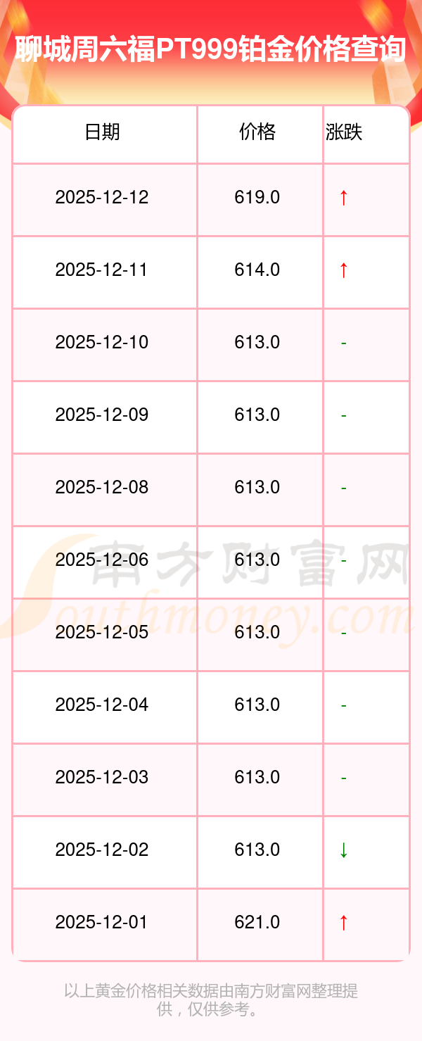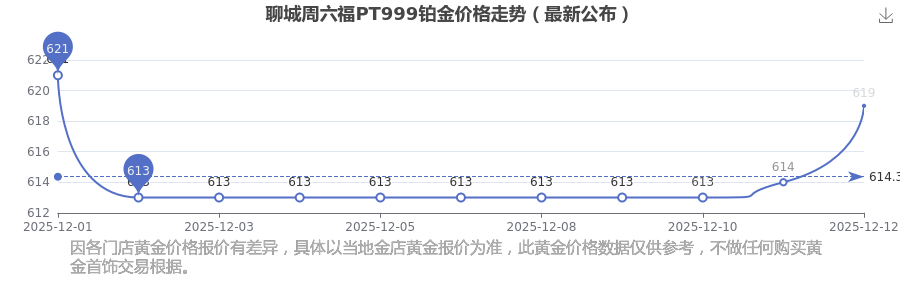 今日2025年12月13日,聊城周六福PT999铂金价格为619.0元/克。