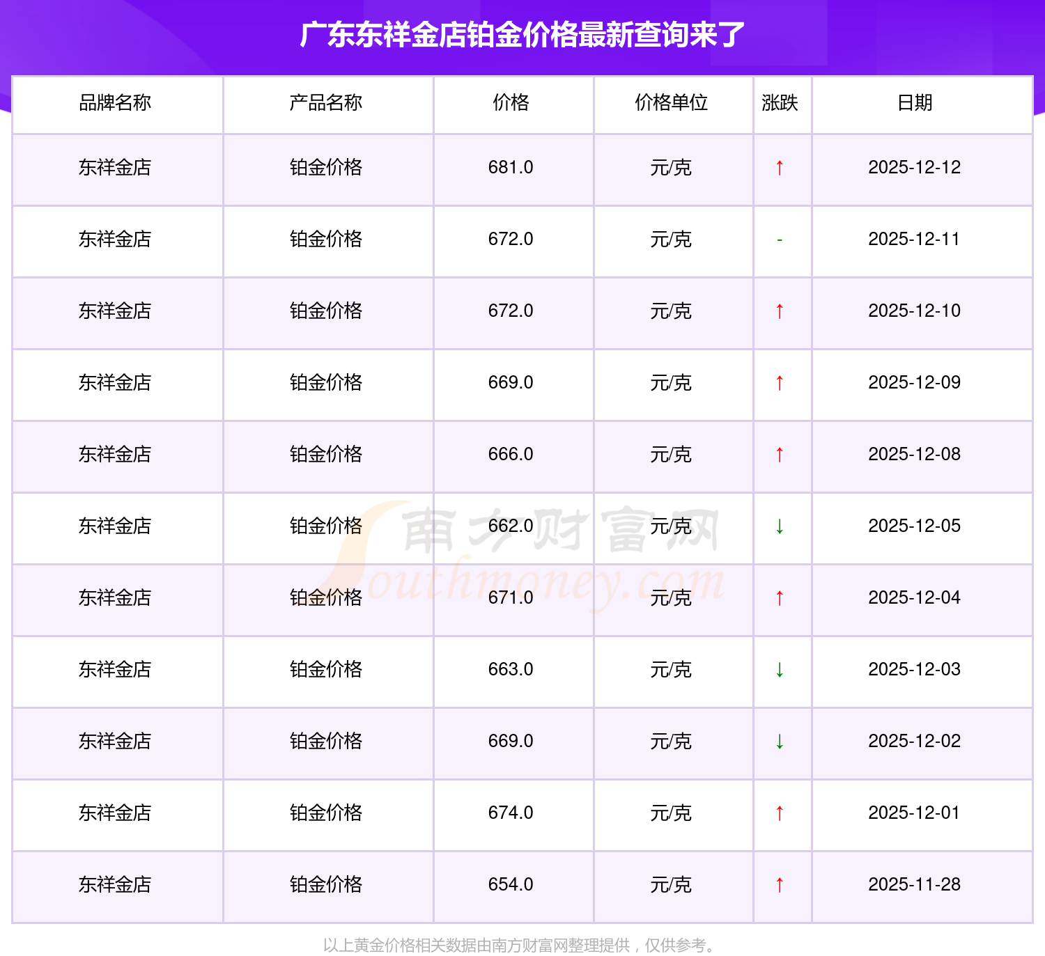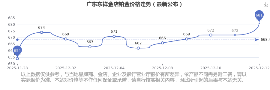 2025年12月13日广东东祥金店铂金价格为681.0元/克。