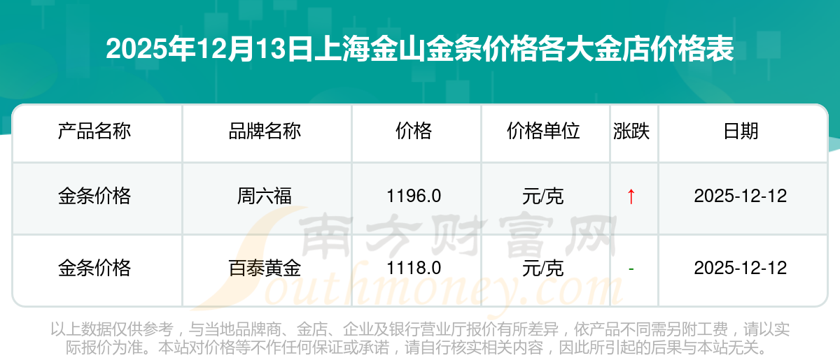 今天是2025年12月13日,上海金山周大福、周大福、老凤祥、老凤祥、老庙、老庙、周生生、周生生、周大福、周大福、周大福等各大金店品牌金条价格最新价格行情是这样的:周大福1336.0元/克、周大福681.0元/克、老凤祥1337.0元/克、老凤祥650.0元/克、老庙1339.0元/克、老庙600.0元/克、周生生1338.0元/克、周生生681.0元/克、周大福1336.0元/克、周大福47410.0、周大福19550.0。
