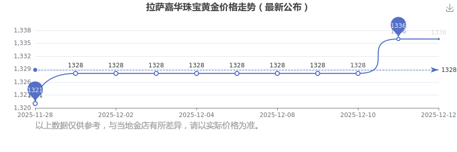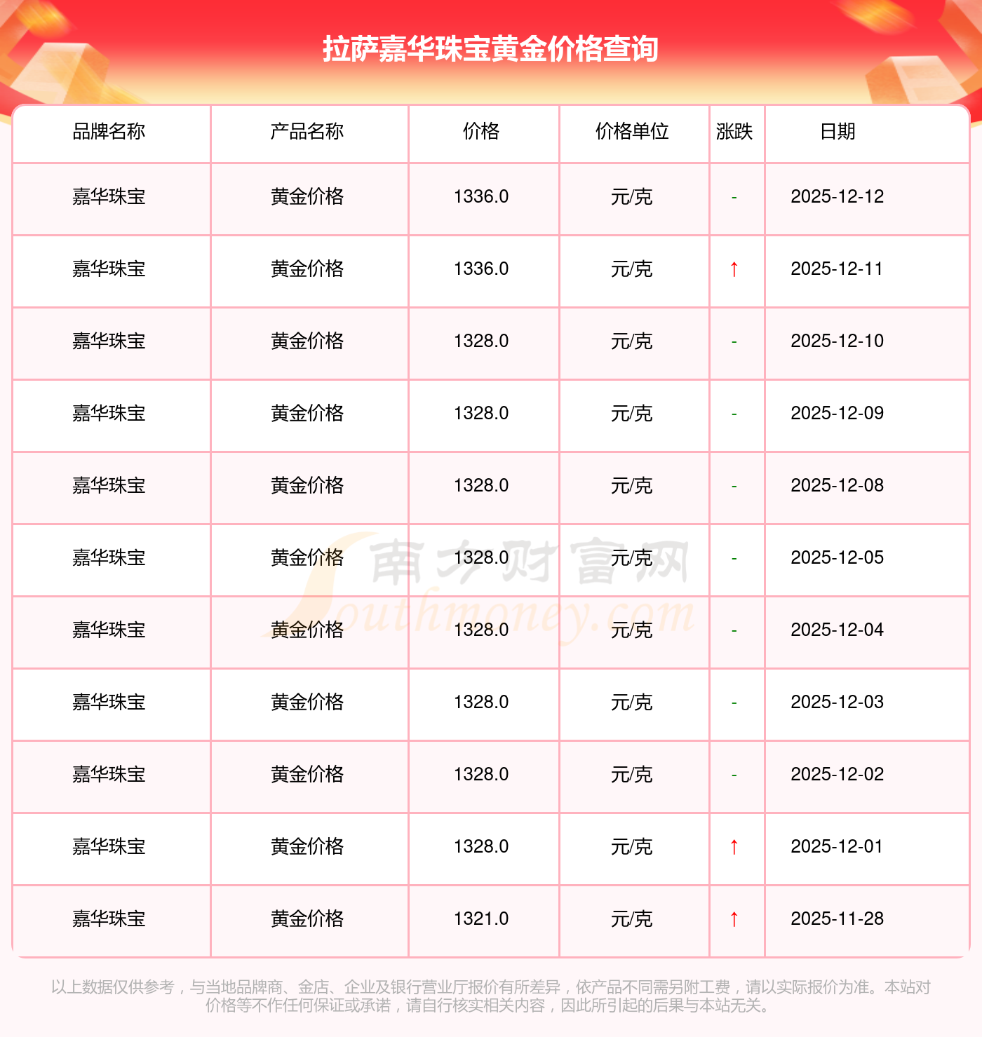 今日拉萨嘉华珠宝黄金价格最新为:1336.0元/克。