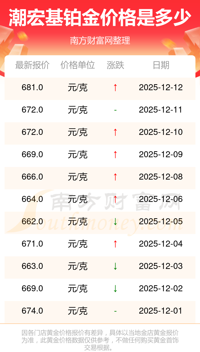 潮宏基今日 铂金价格的最新市场行情价为681.0元/克。